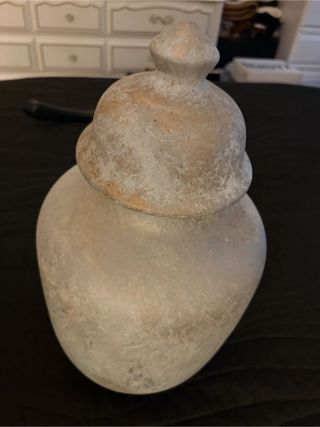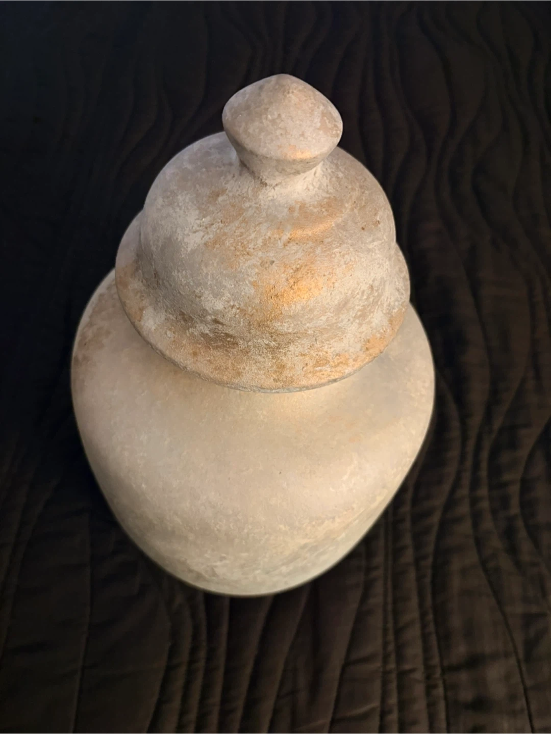 Selling a decorative stone jar with a lid. It's in great condition and would look lovely in any room. It has a rustic, earthy feel to it!