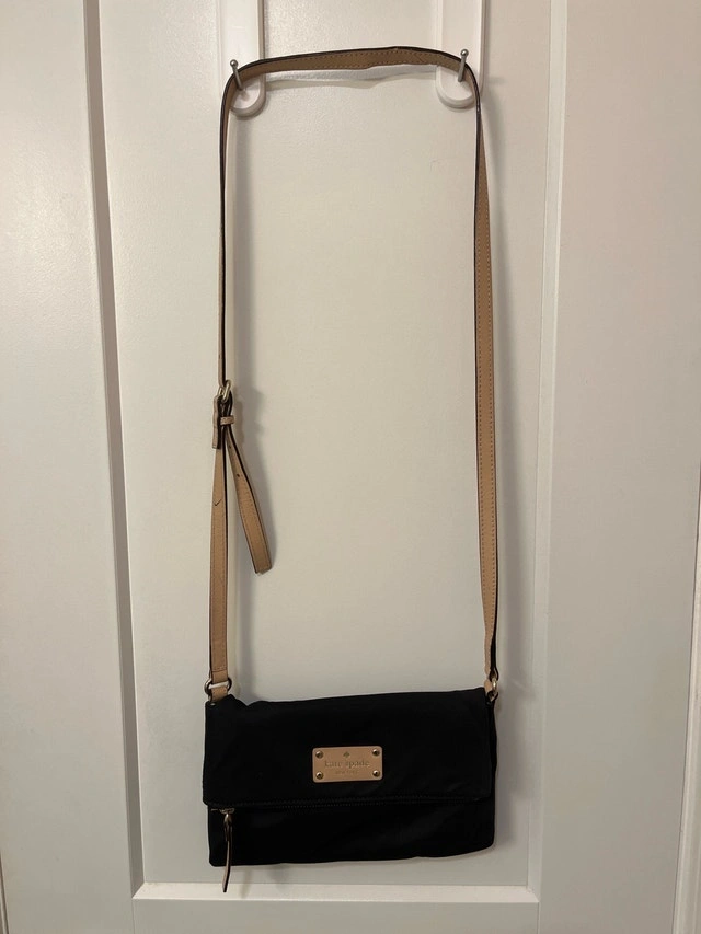 This is a stylish Kate Spade New York cross body bag crafted from durable black fabric with a tan-coloured adjustable strap and a polka dot interior lining. This bag is in good condition, showing some signs of wear, but is still a fashionable and functional accessory. Here are some additional details: