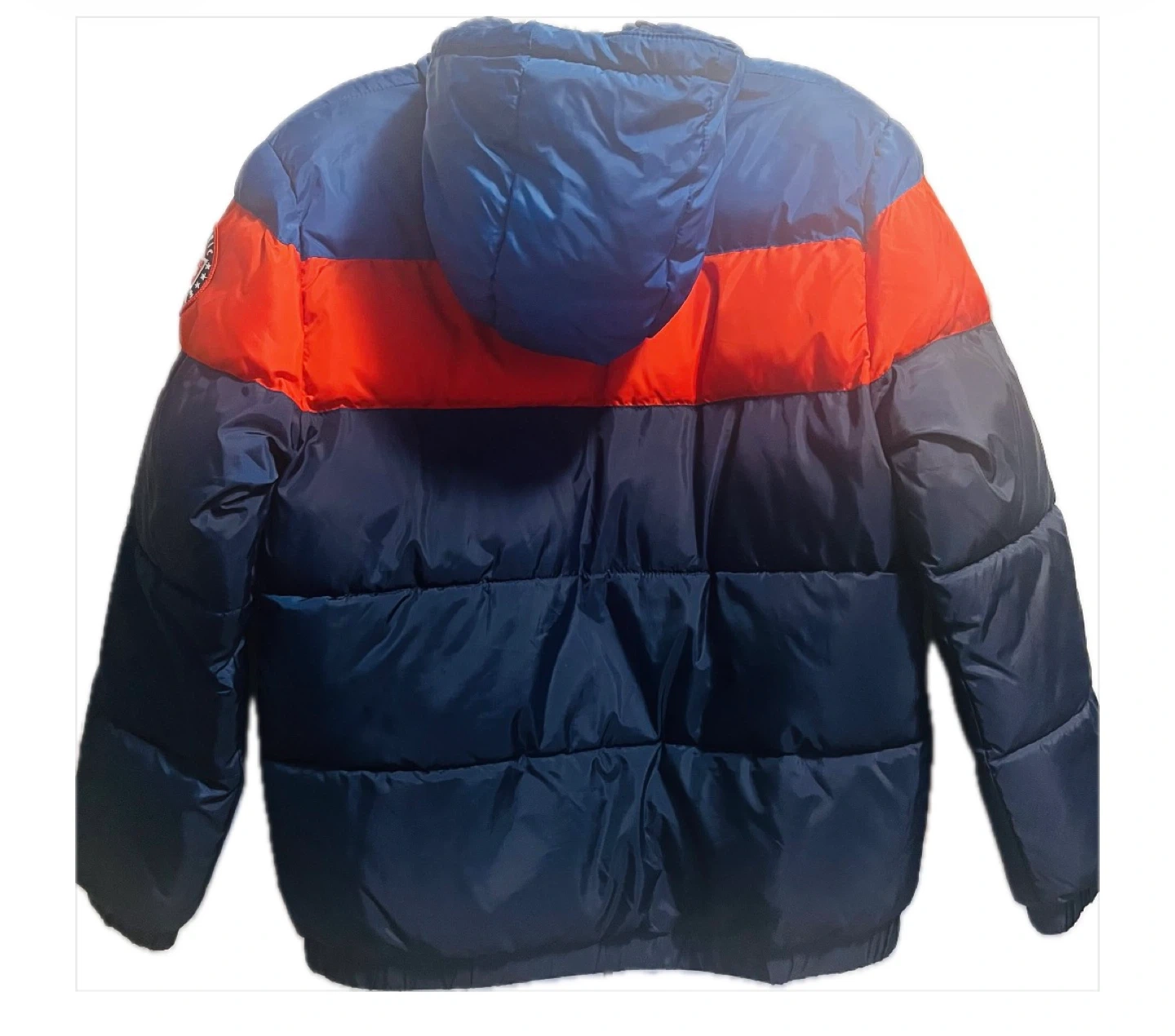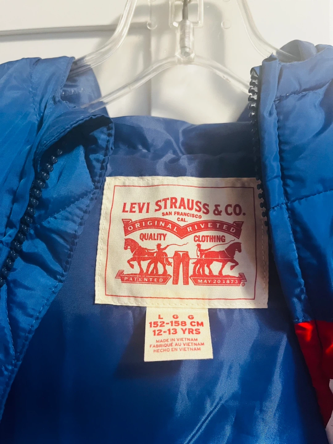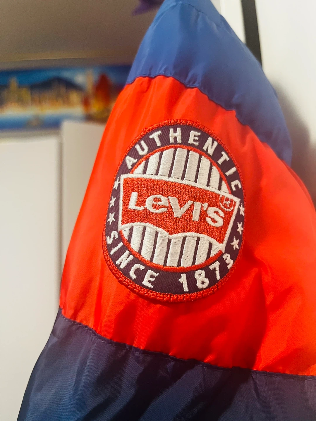 Selling a Levi's puffer jacket in size L (12-13 years). The jacket is in great condition and features a cool colour block design with navy blue and red. It's a warm and stylish jacket for the colder months!