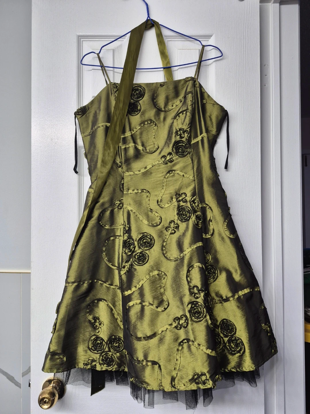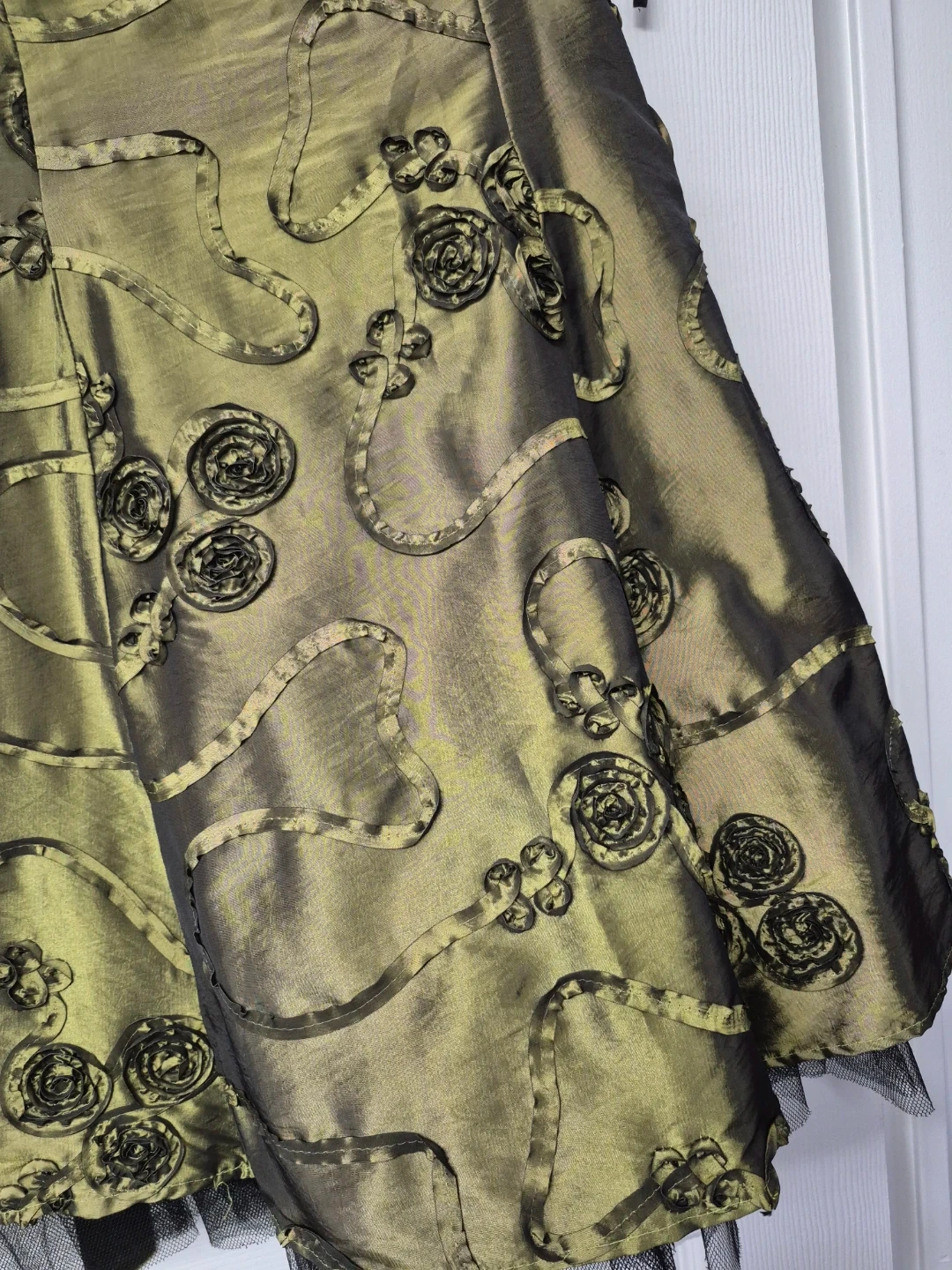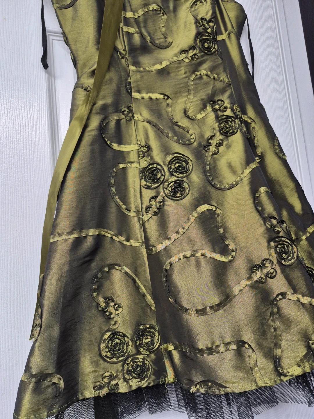 This olive green dress features a shimmering iridescent fabric with black floral appliqu és and ribbon details. It's perfect for a special occasion or evening wear!