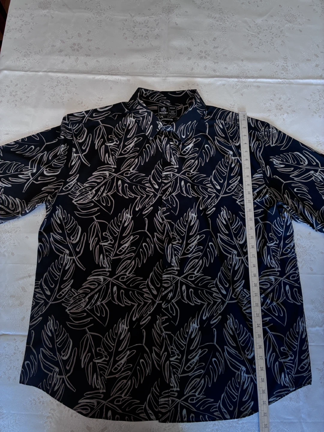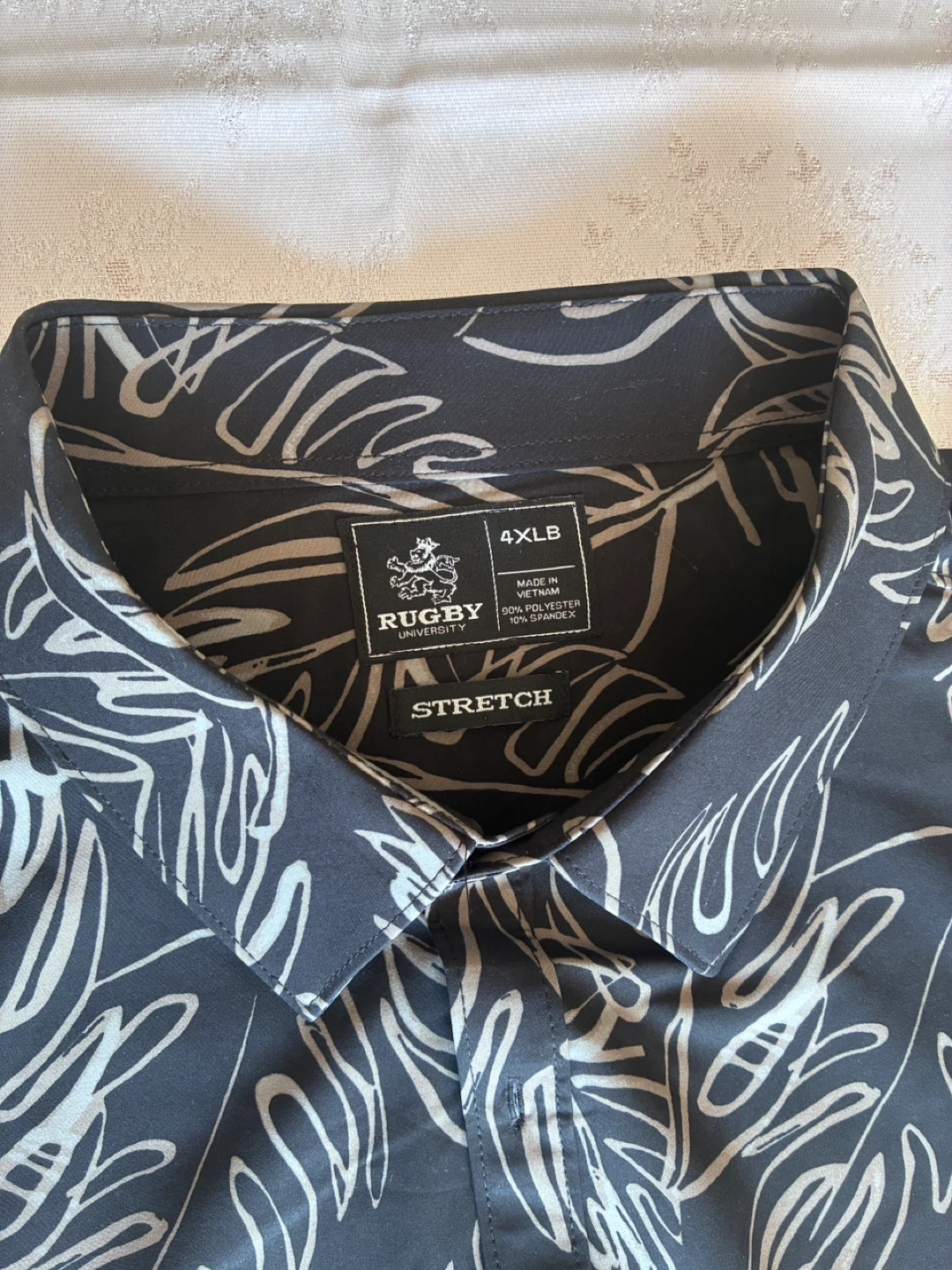 Men's short sleeve button-up shirt from Rugby University. It's a size 4XLB and made with 90% polyester and 10% spandex for stretch. The shirt features a black background with a beige leaf print.