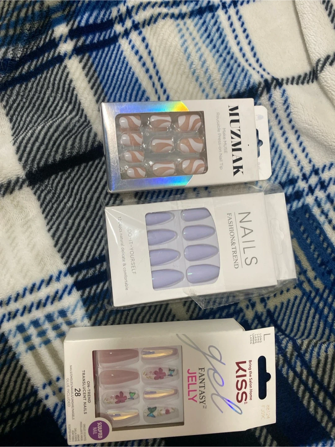 Three different sets of press-on nails are included. One set is from MUZMAK with a brown and white swirl design. Another set is from Kiss Gel Fantasy Jelly with a clear base and floral/butterfly decals. The third set is a plain light purple colour from Fashion & Trend. All sets come with glue included. Pick up cash only