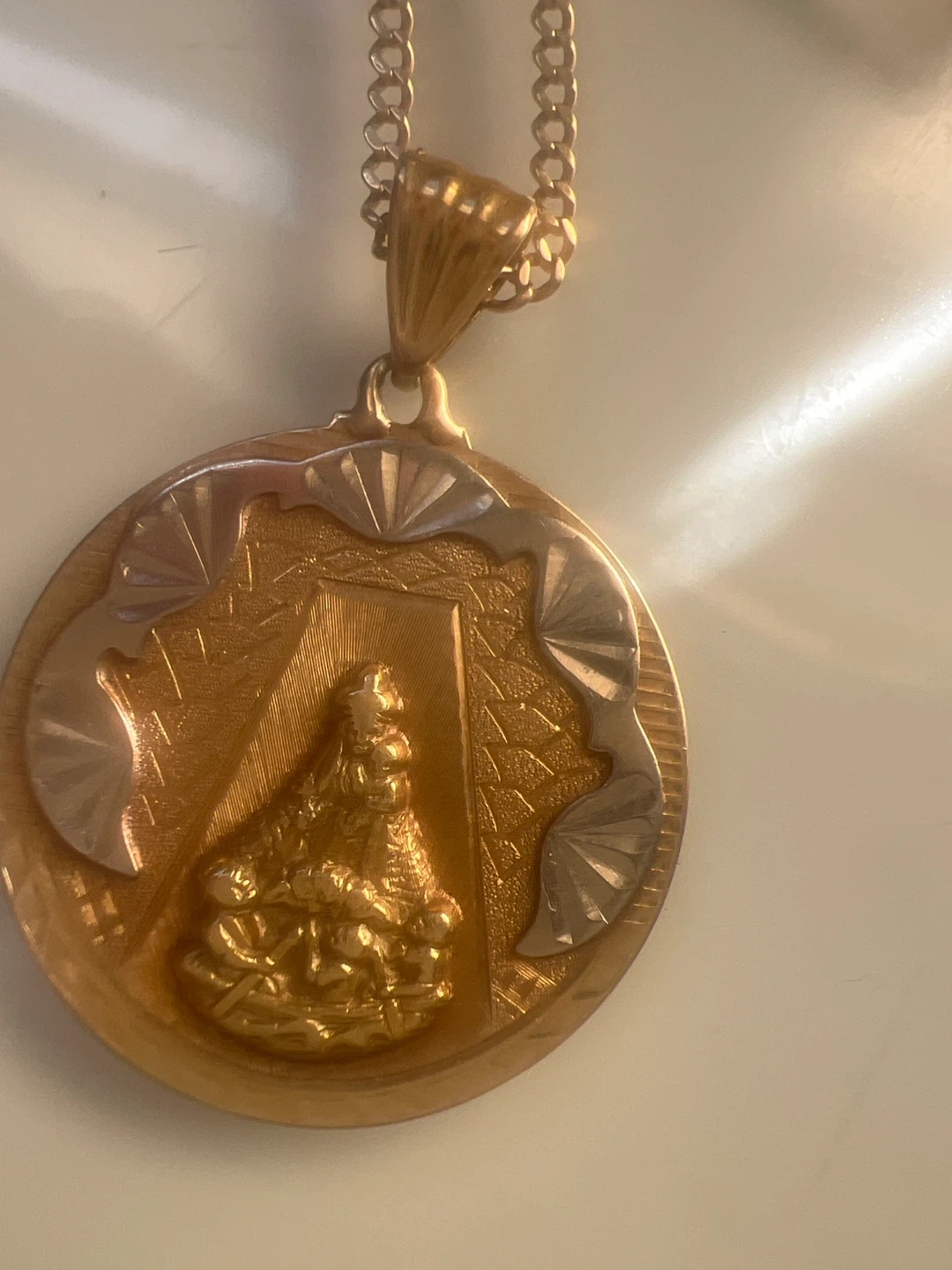 A gold-tone pendant necklace featuring a religious figure. It has a textured background and a decorative border. The chain is a classic link style. This piece would make a thoughtful gift.