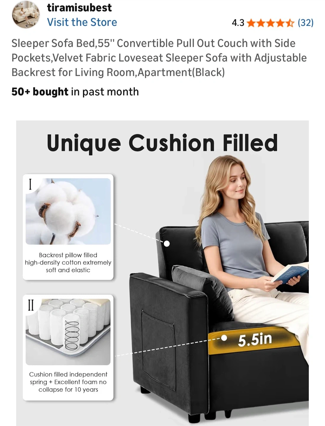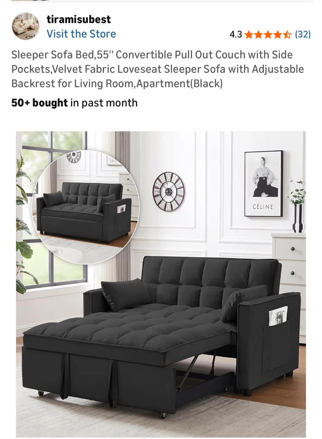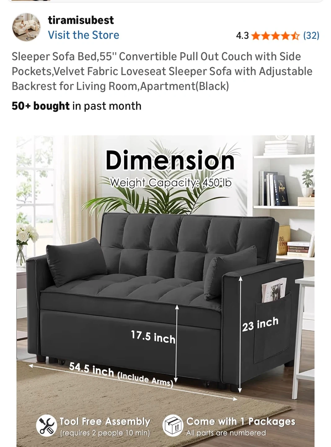 Bought new on Amazon (about $350 all-in) and assembled only once. It was never slept on because we realized the pull-out “sofa bed” does not function as expected. It was immediately returned to the box.
