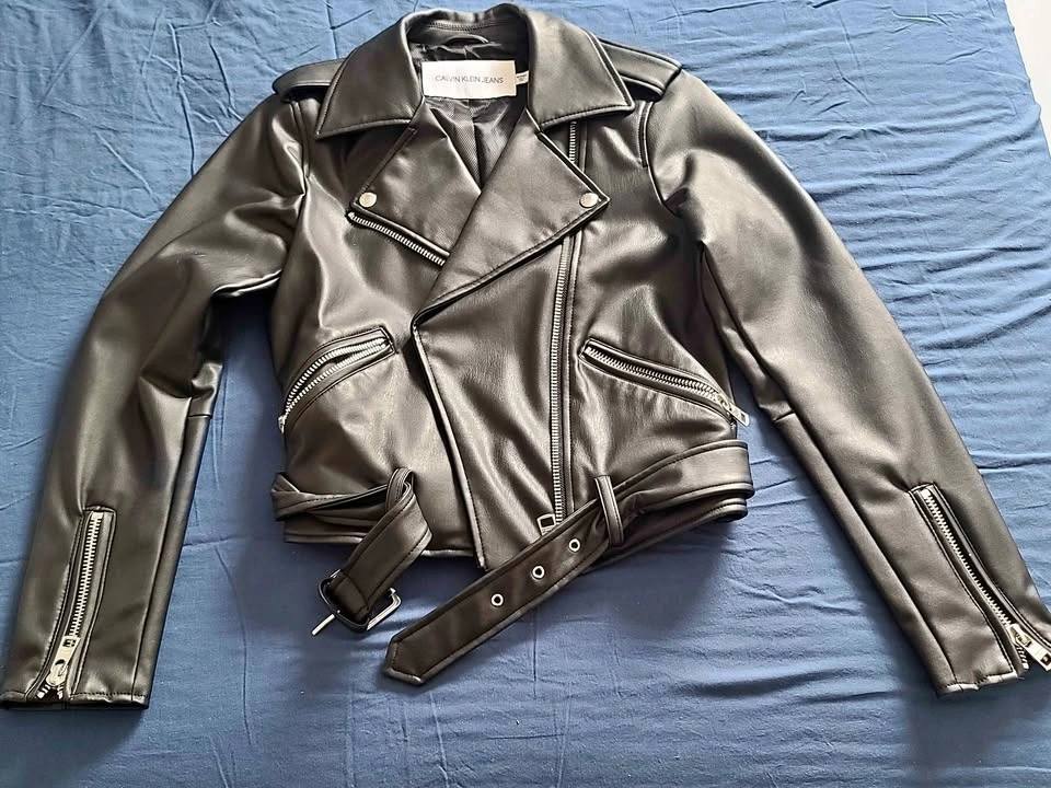 Stylish black biker-style jacket from Calvin Klein Jeans. Size XS. Faux leather material. Asymmetrical front zipper. Zipper pockets and sleeve zippers. Adjustable waist belt. Fully lined inside. Very trendy and perfect for fall or spring.