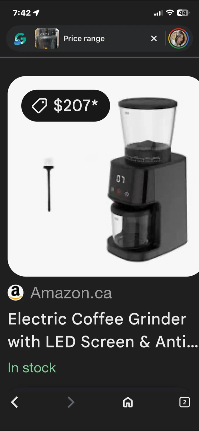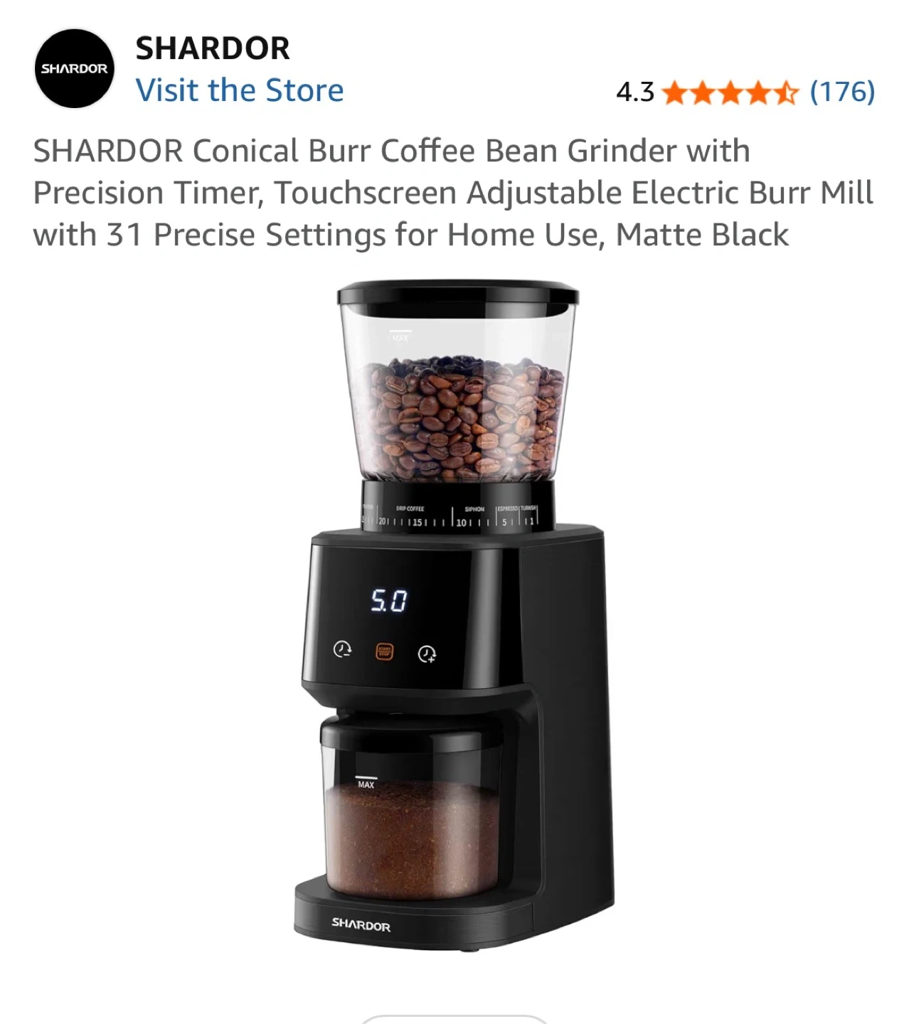 SHARDOR conical burr coffee bean grinder with precision timer. It features 31 precise settings for home use. This grinder is matte black and has an LED screen.