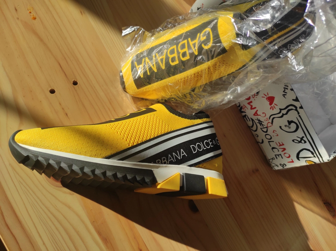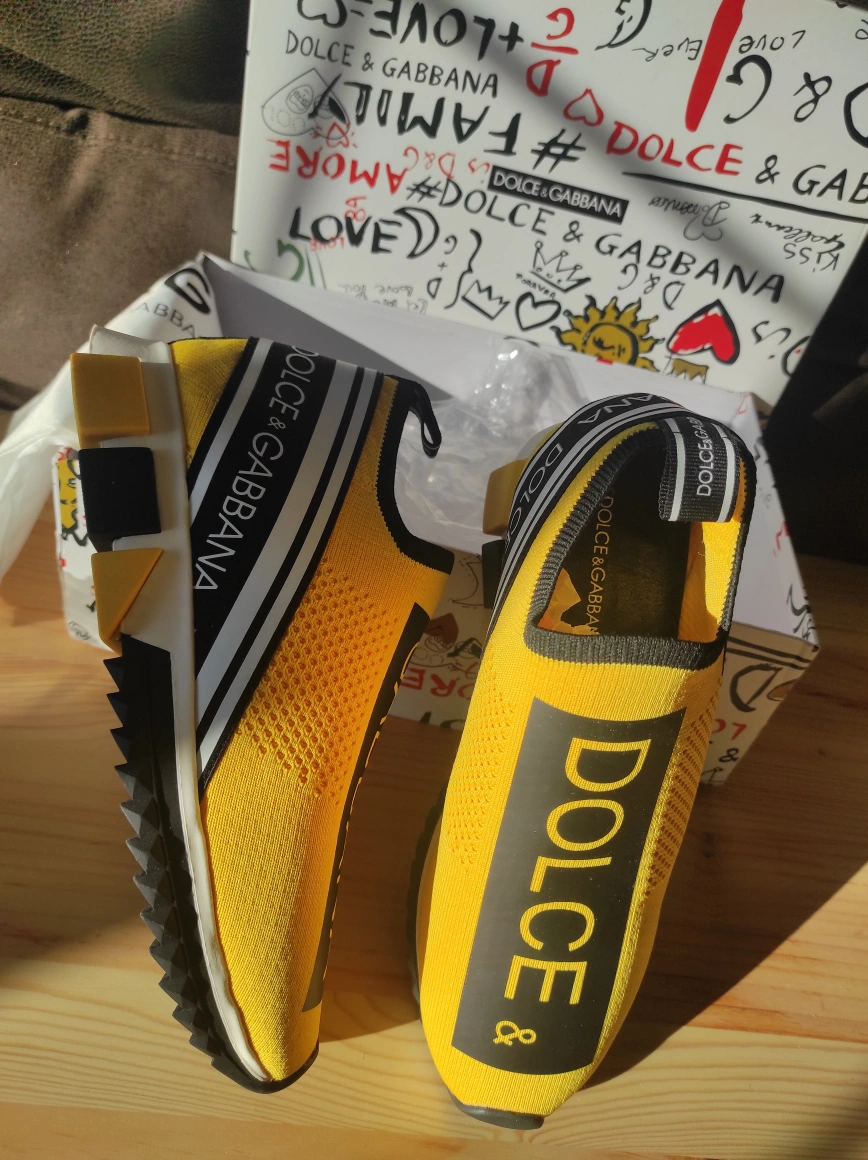 Brand new Dolce & Gabbana slip-on sneakers. Bright yellow knit upper. Black and white logo detailing. Comfortable and stylish. Come in original box.