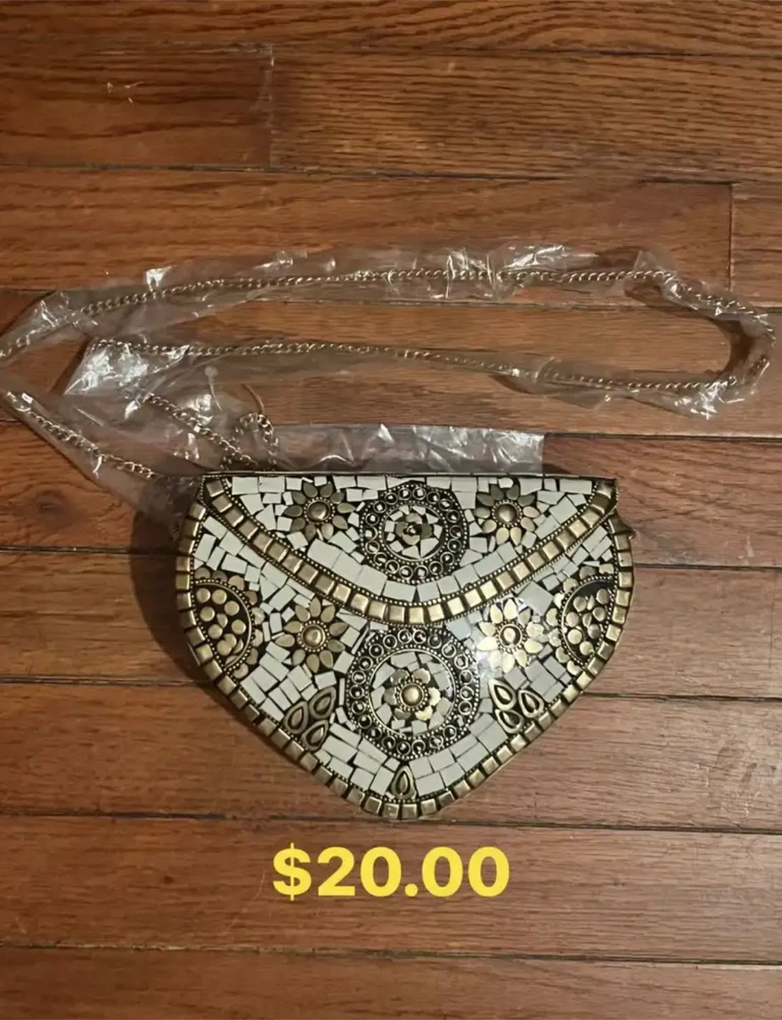 This unique clutch features intricate mosaic-style embellishments with a vintage feel. It includes a detachable metal chain strap for versatile wear. The metallic accents and geometric patterns add a touch of elegance!