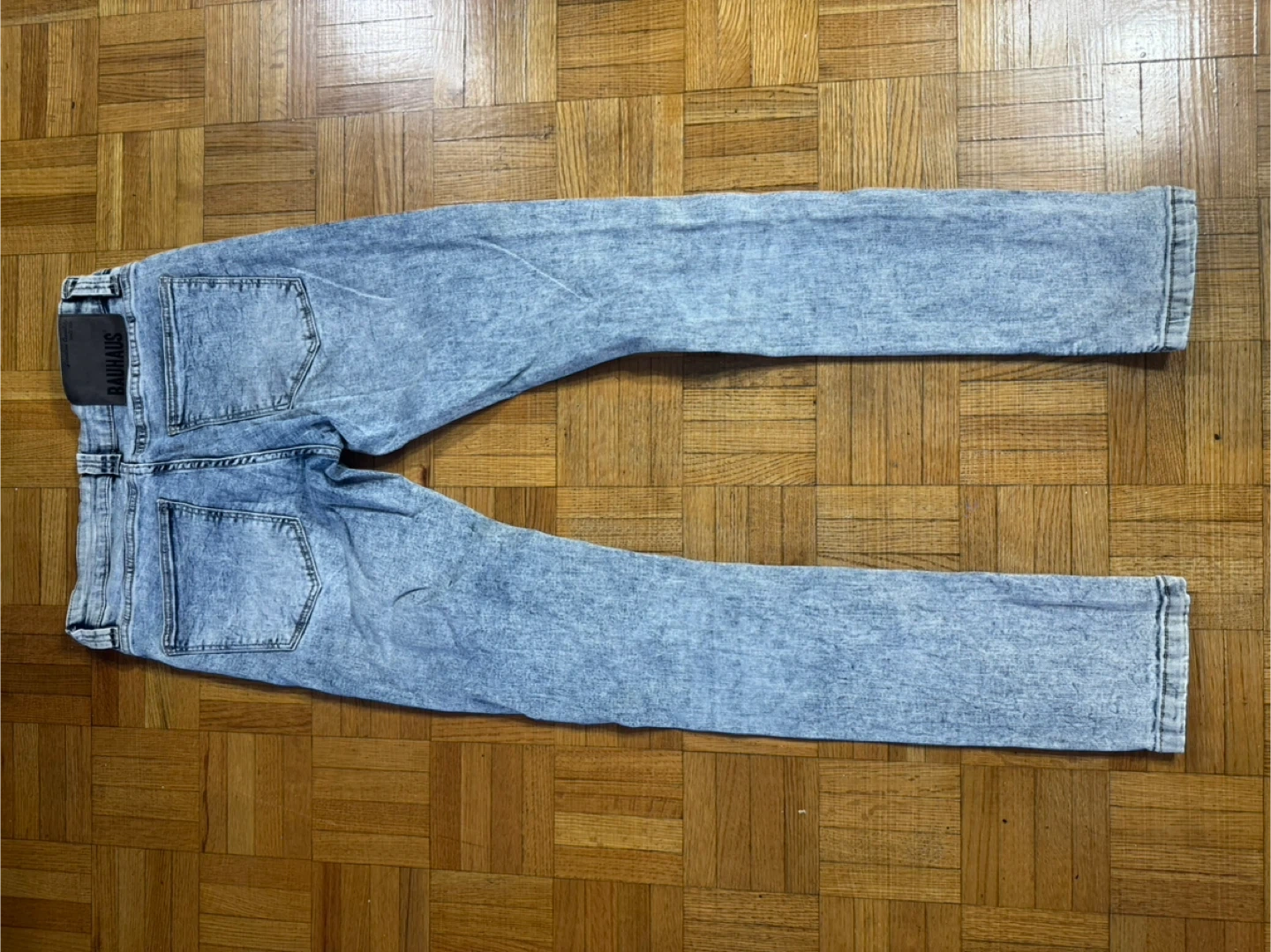 Light blue acid wash denim jeans with distressed rips. Classic five-pocket style. These jeans offer a modern distressed look.