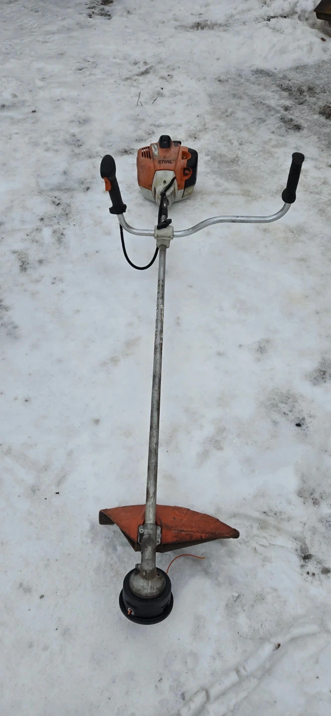 This is a Stihl string trimmer. It has a gas engine and a U-handle design. Great for trimming grass and weeds in your yard! Model fs130.