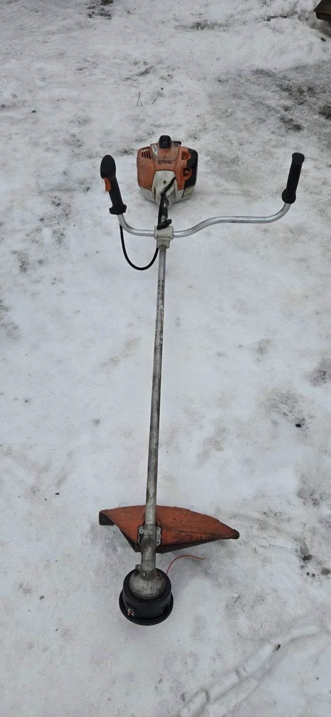 This is a Stihl string trimmer. It has a gas engine and a U-handle design. Great for trimming grass and weeds in your yard! Model fs130.
