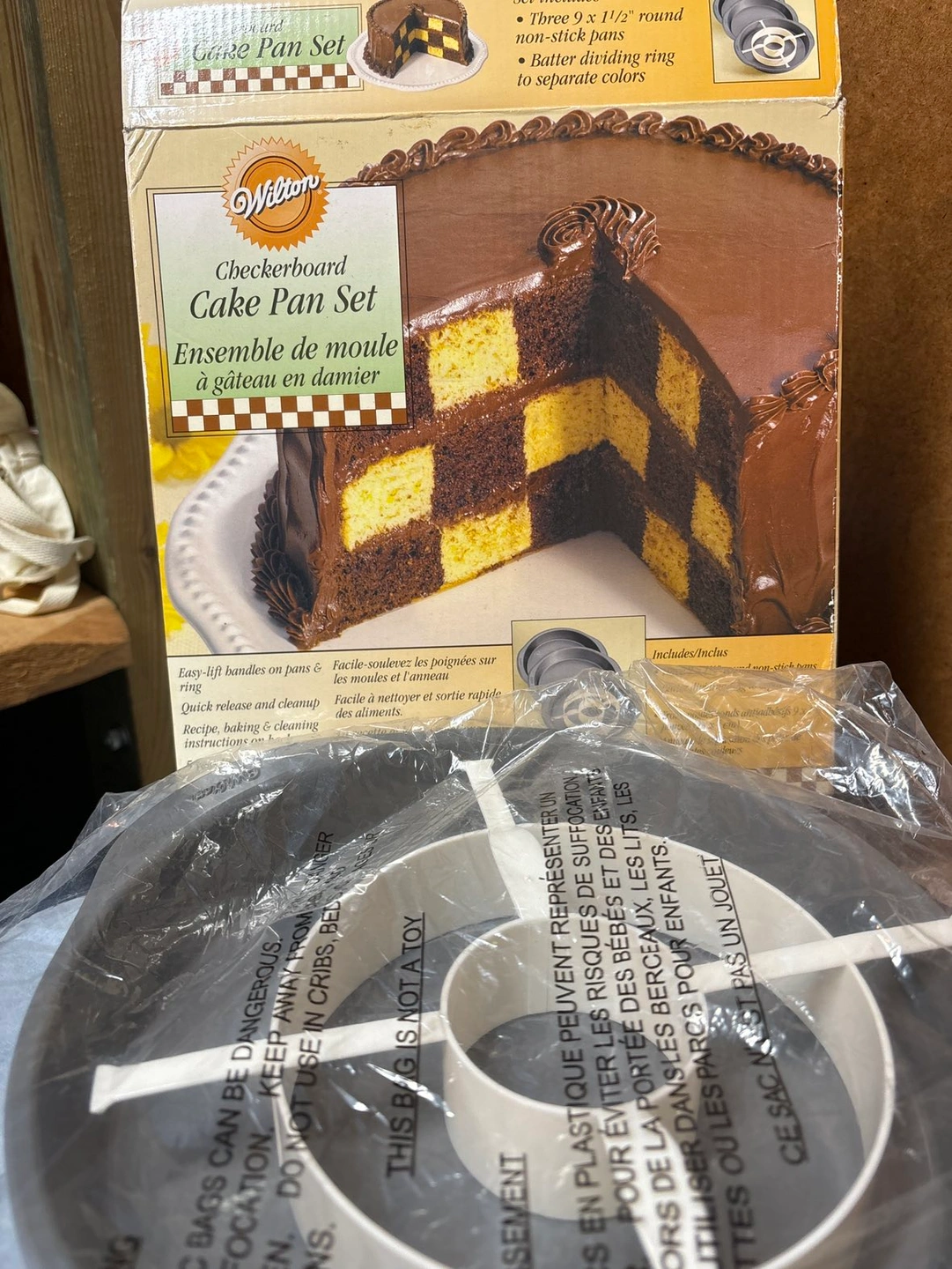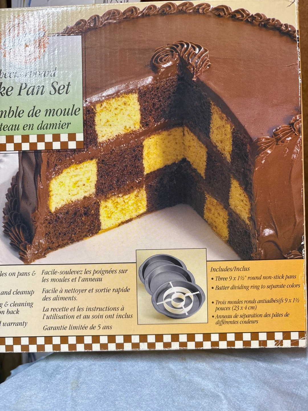 NIB Wilton Checkerboard round cake pan set. Includes three 9 1/2” round non-stick pans.