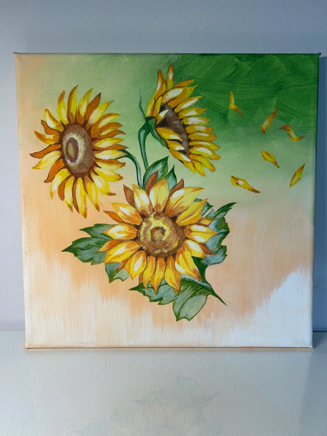 Hand-painted acrylic artwork. Features three sunflowers, green and yellow background, and falling petals.