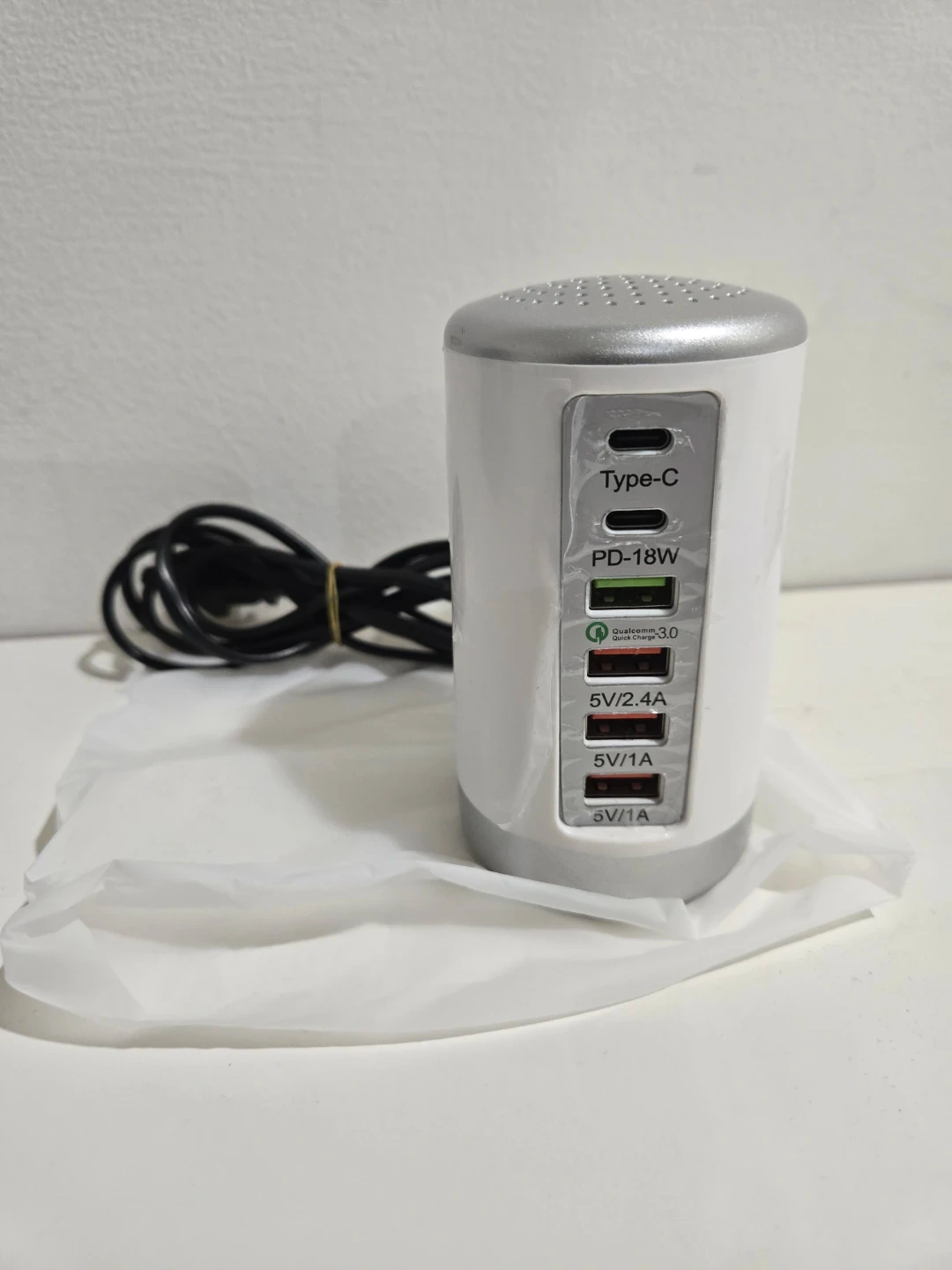 Selling a charger with multiple ports! It features a Type-C port with PD-18W, Qualcomm Quick Charge 3.0, and three 5V ports with varying amperage (2.4A, 1A, 1A)