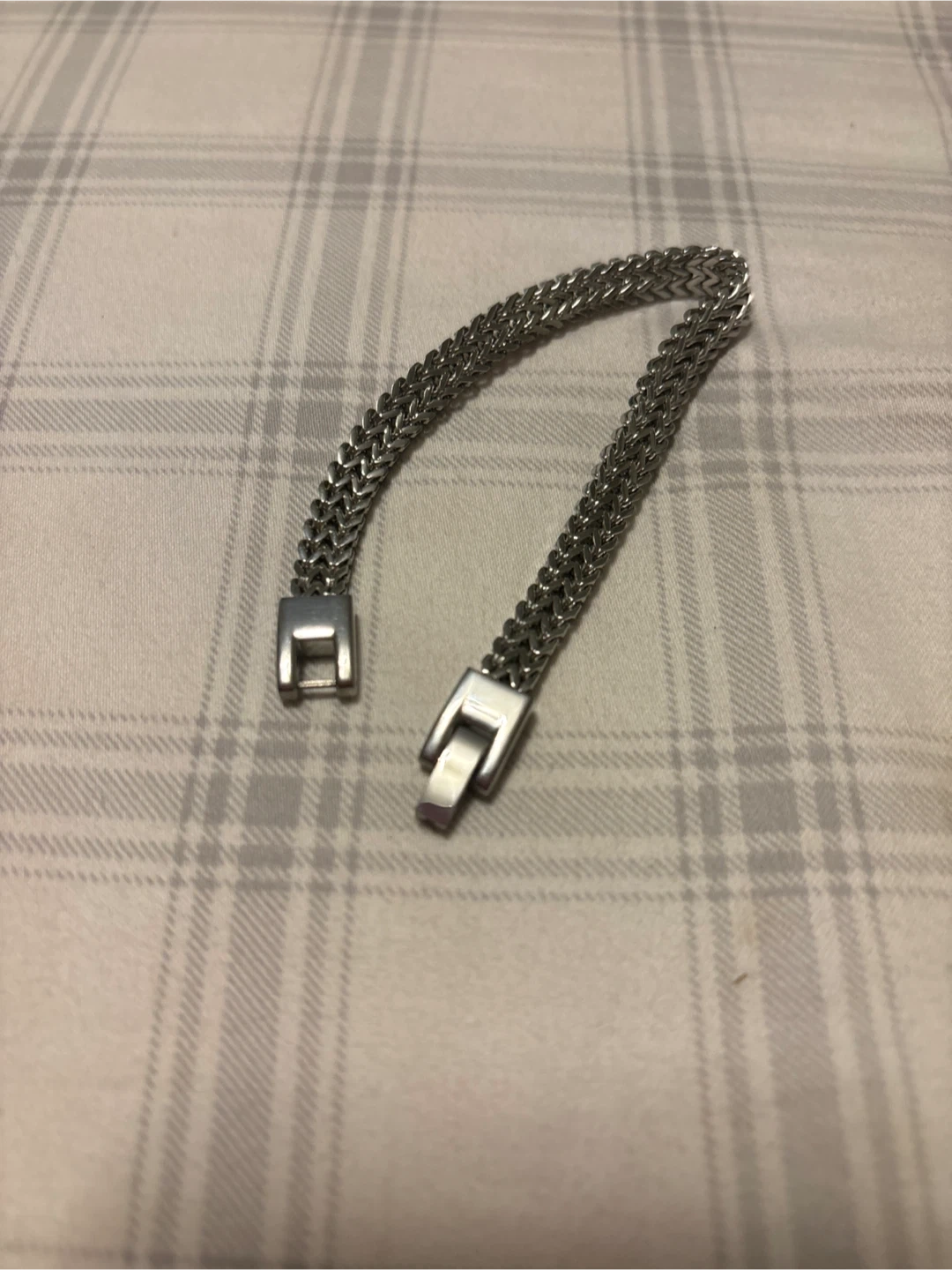 A sleek silver chain bracelet with a double-row interlocking design. It features a secure clasp closure. This piece adds a touch of style to any outfit.