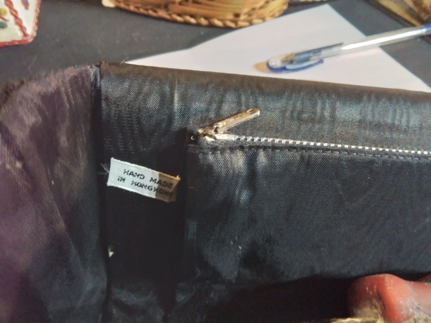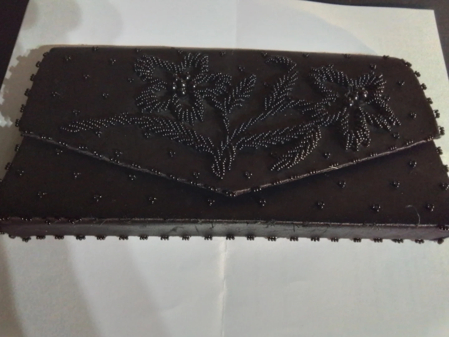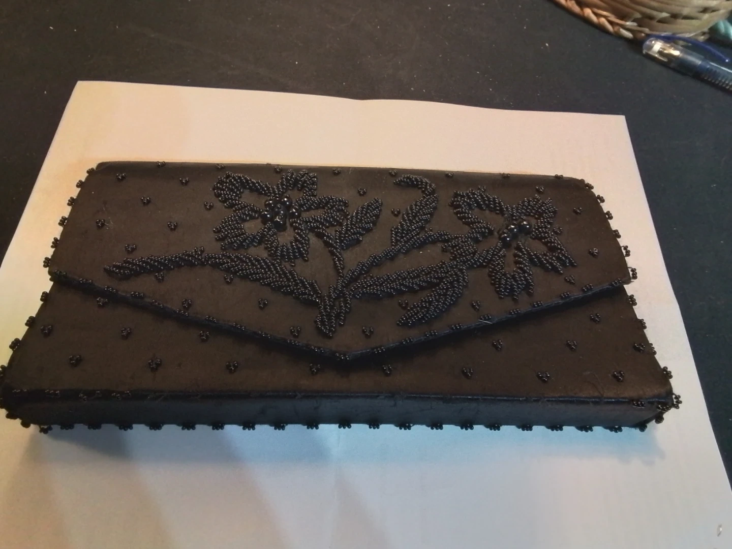 This is a vintage, hand-made black satin clutch bag adorned with intricate floral beading, measuring 8.5x4.5 inches, and crafted in Hong Kong. It features a unique design and a compact size, perfect for evening outings or special occasions. The bag is in used but Exellent condition.