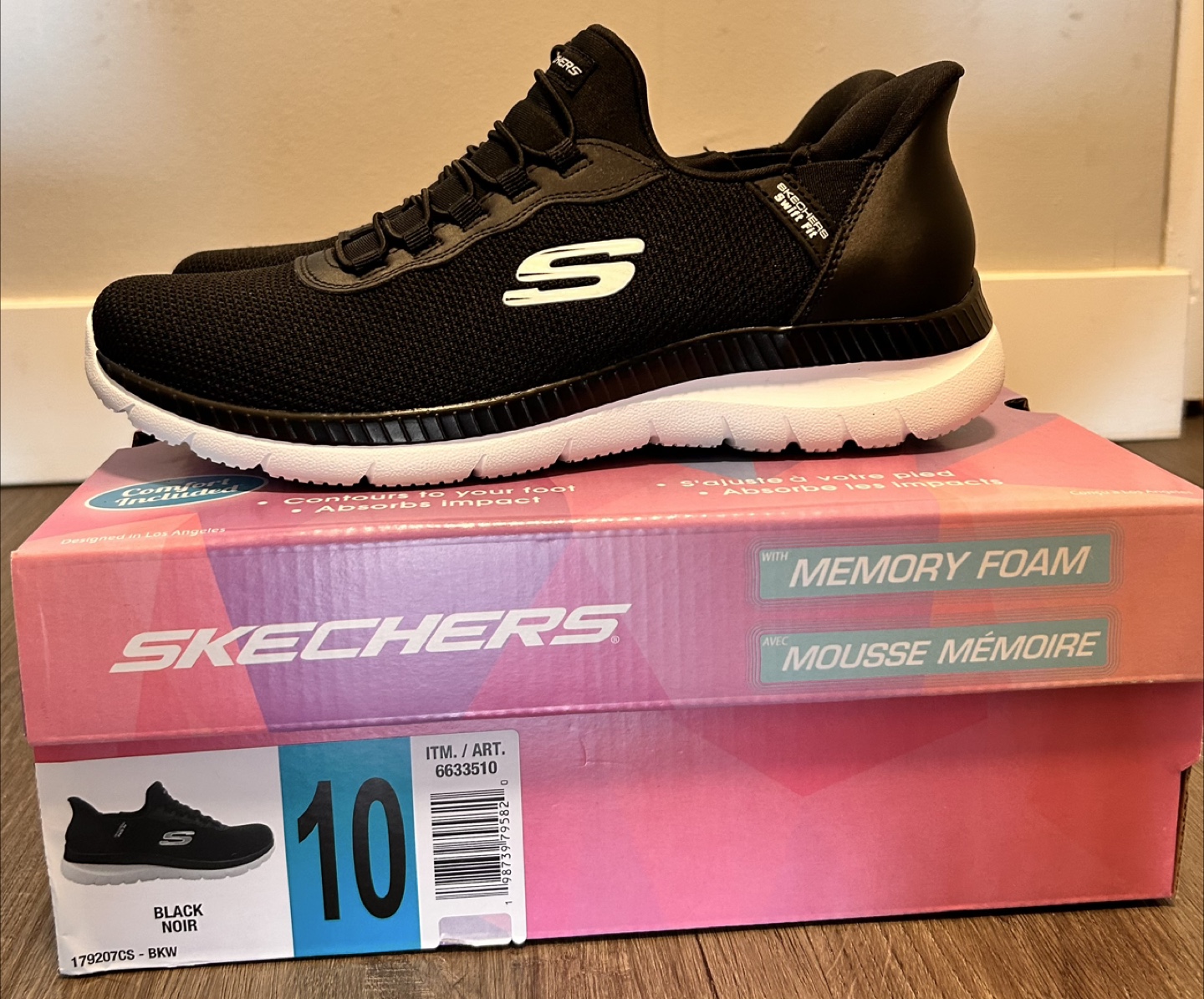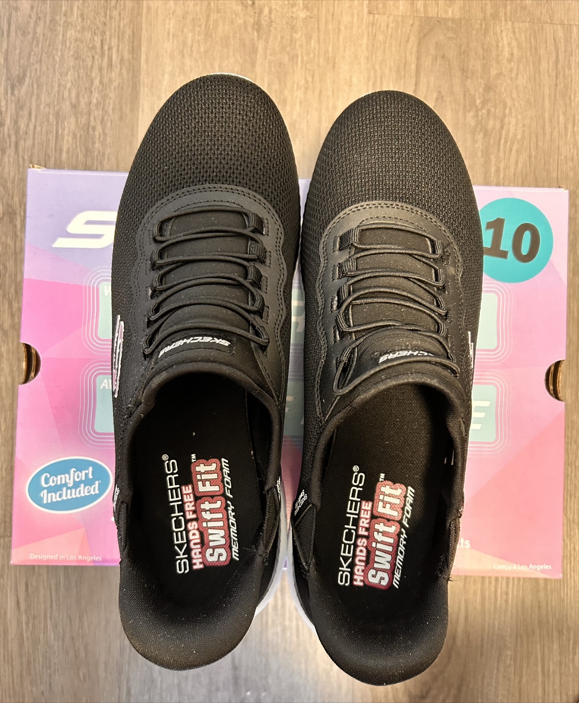 Selling a pair of Skechers Hands Free Slip-ins with Swift Fit memory foam! They are black and a size 10. The box is included, featuring comfort and impact absorption. These shoes contour to your foot for a great fit.
