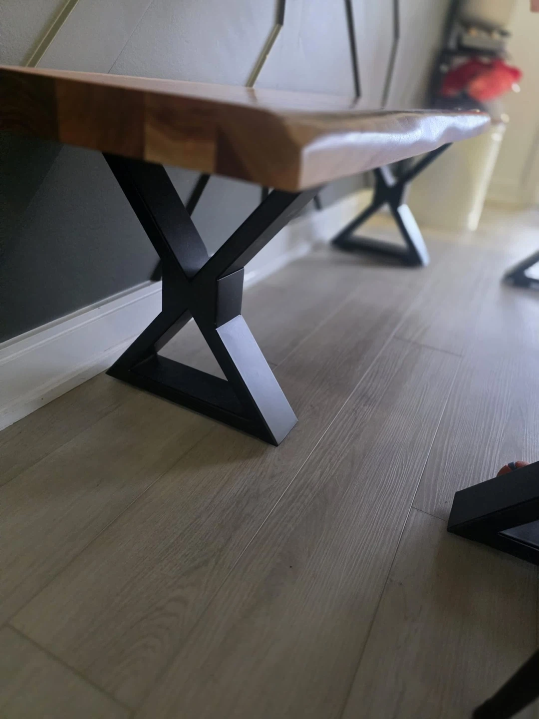 Beautiful live edge wood dining table with a matching bench! The table features a unique, natural edge and sturdy black metal legs. It's a great centerpiece for any dining room, adding a touch of rustic charm