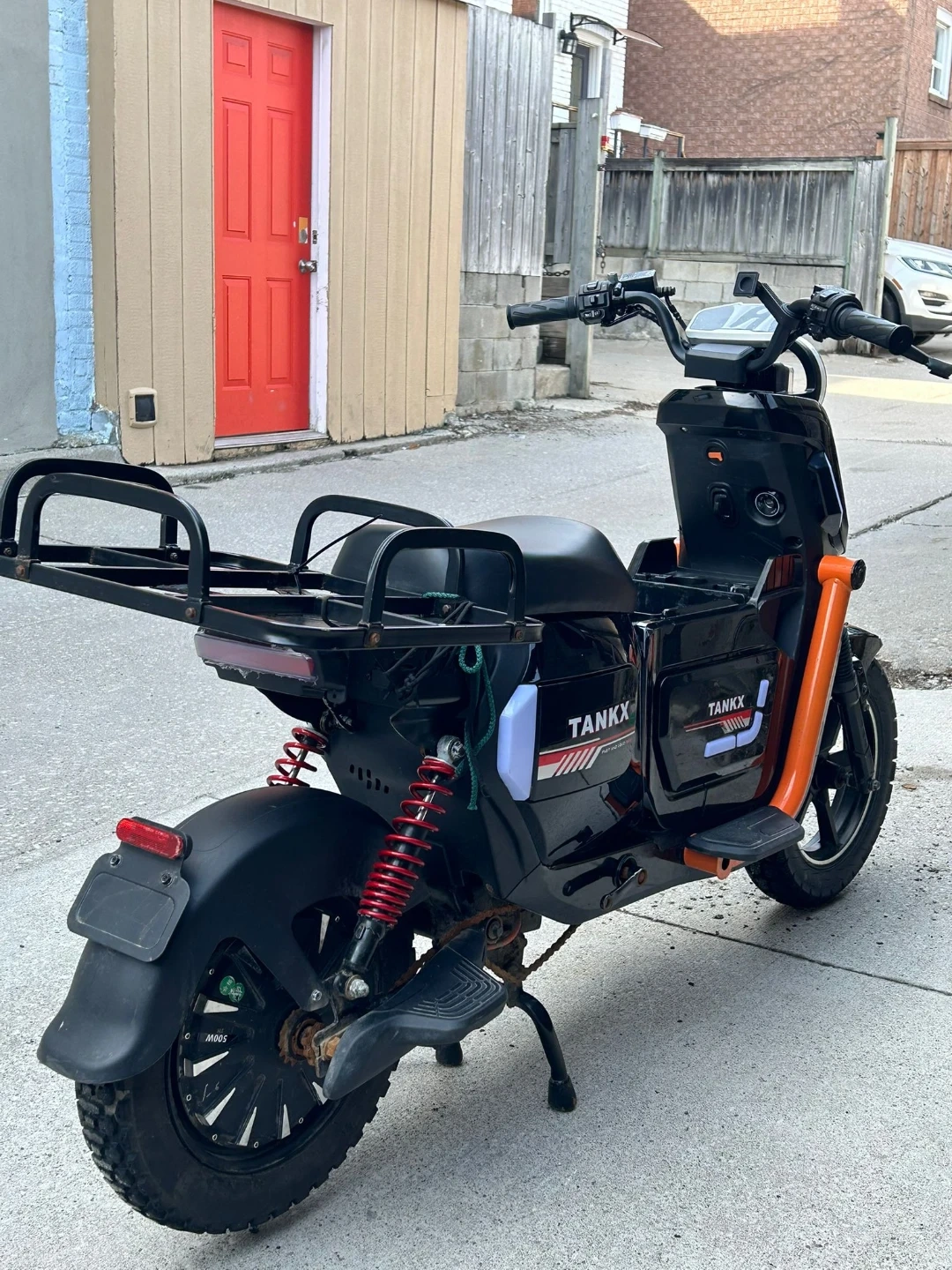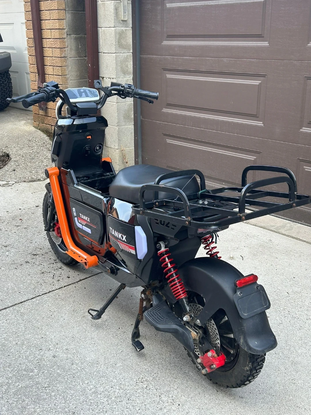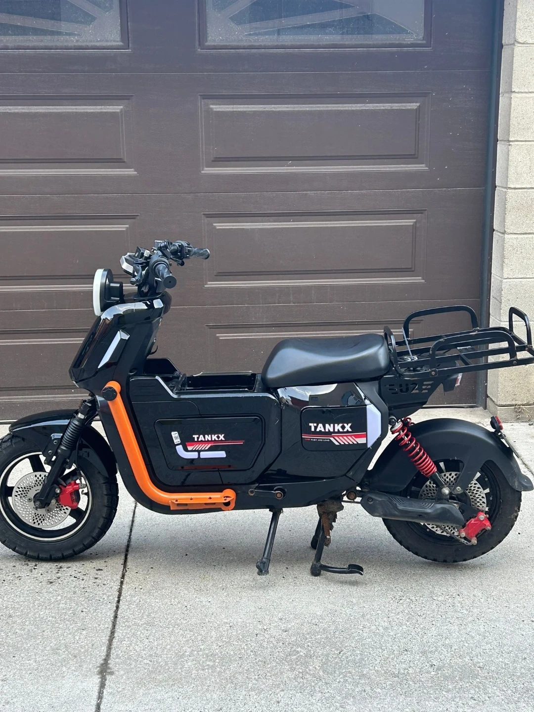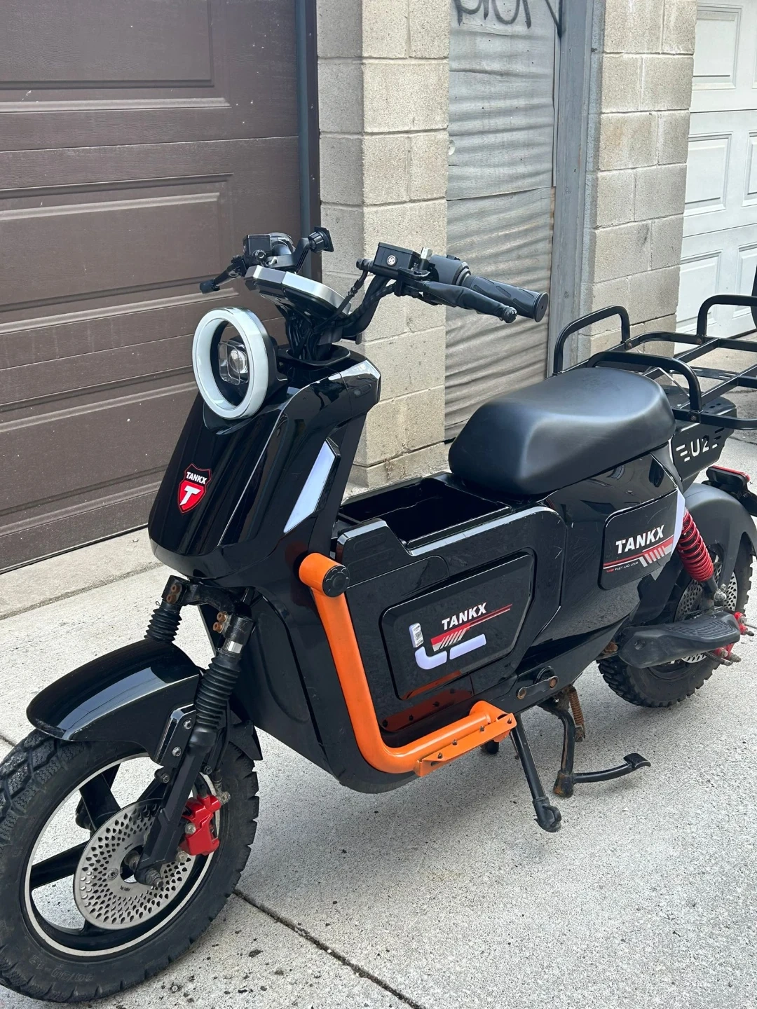 This is a black TANKX electric scooter. It features an orange frame accent and a rear cargo rack. Perfect for quick trips around town!
