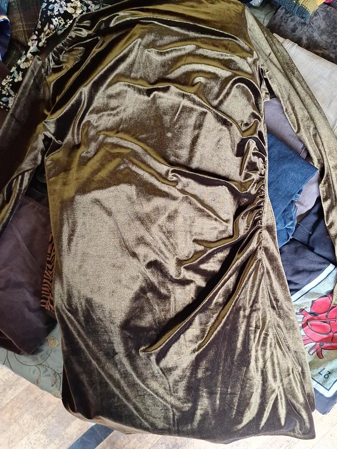 A shimmering velour dress with ruched detailing on the side. It has long sleeves and a smooth, draped fabric. Perfect for a night out!