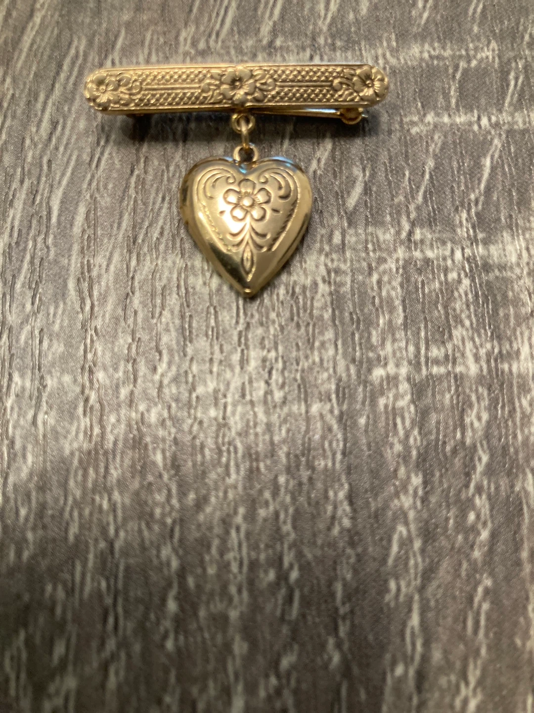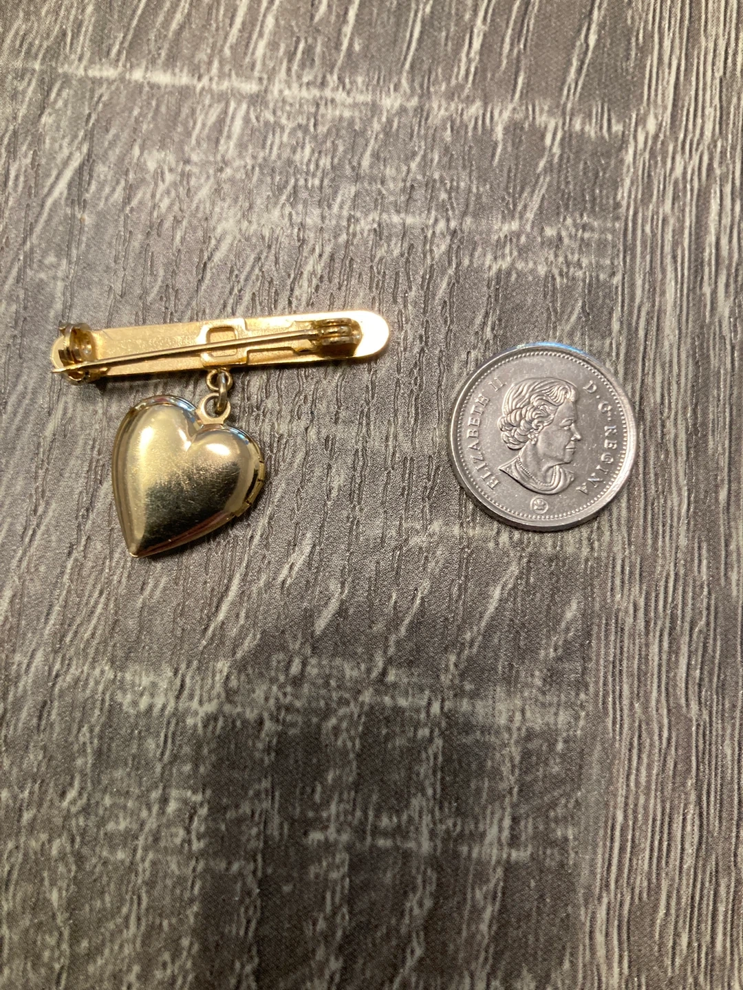 A lovely gold-toned heart locket brooch. It opens to hold tiny keepsakes. The pin secures well and it's ready to add a touch of charm to any outfit!