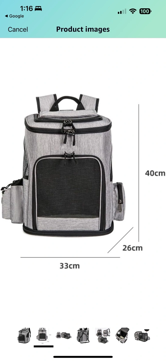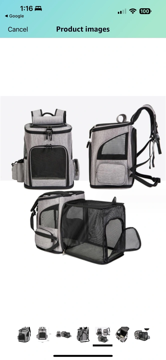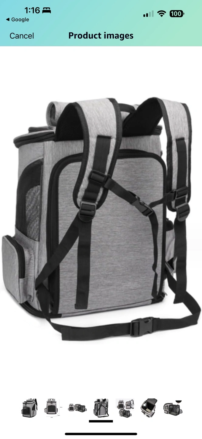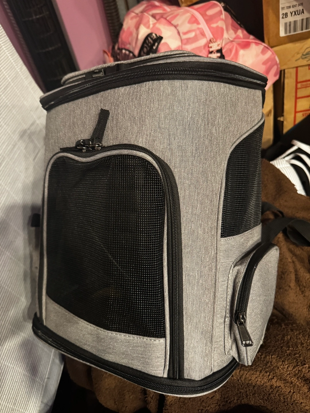 Grey pet carrier backpack. Multiple pockets. Mesh ventilation. Adjustable straps. Great for cats or small dogs.