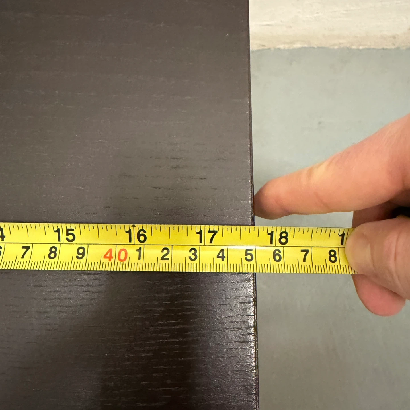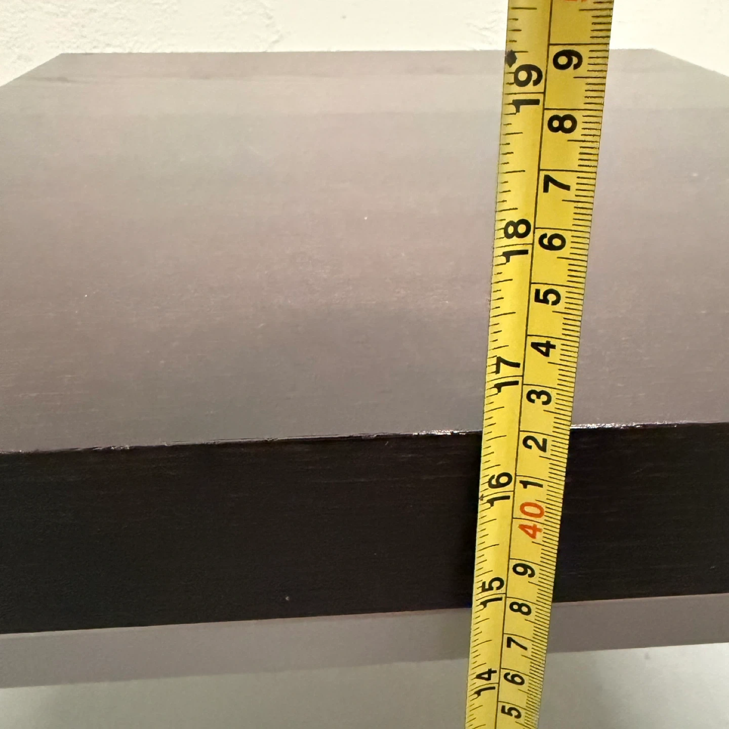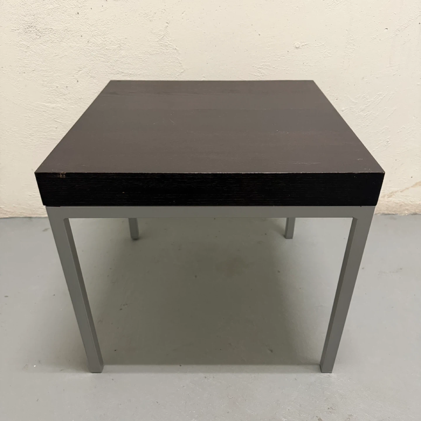 A simple square end table with a dark wood-look top and sleek grey metal legs. It's 45 x 45 cm surface and 42 cm tall. This table is useful next to a sofa or chair for drinks and remotes.