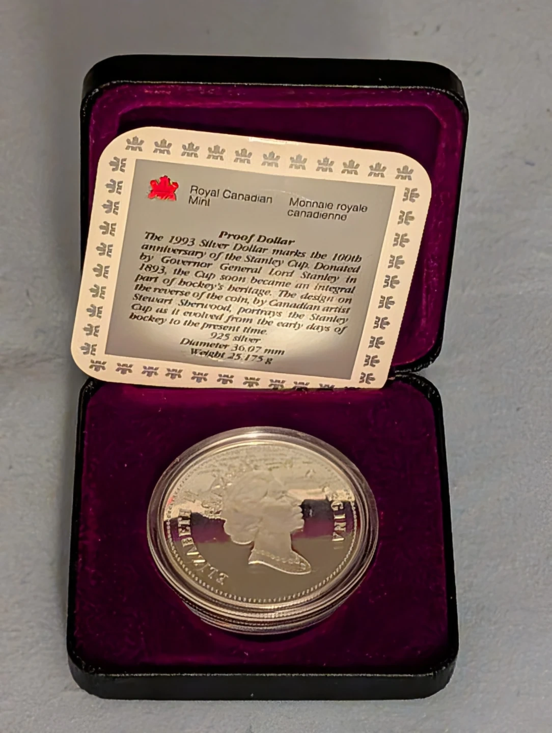 It was produced as a non-circulating, collector coin. is a 1993 Proof Dollar coin from the Royal Canadian Mint commemorating the 100th anniversary of the Stanley Cup. The coin is silver with a diameter of 27.13 mm and weighs 25.175 g. It comes in its original presentation case and box.