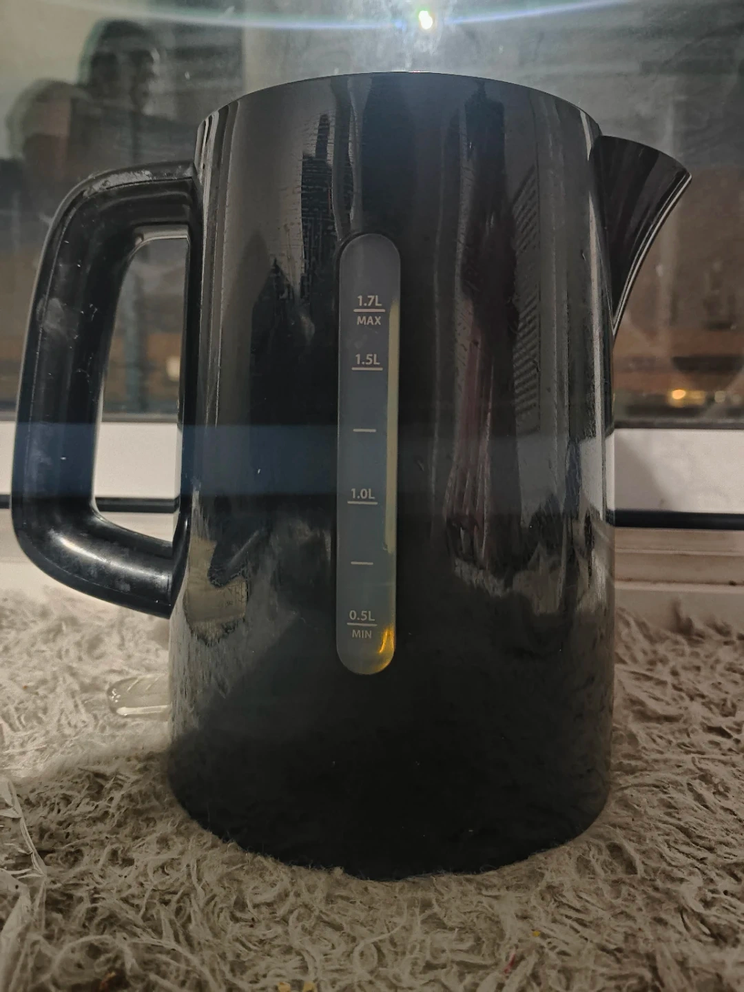 This is a black electric kettle from Toastmaster. It has a maximum capacity of 1.7L and a minimum fill line of 0.5L. It's great for quickly heating water for tea or coffee.