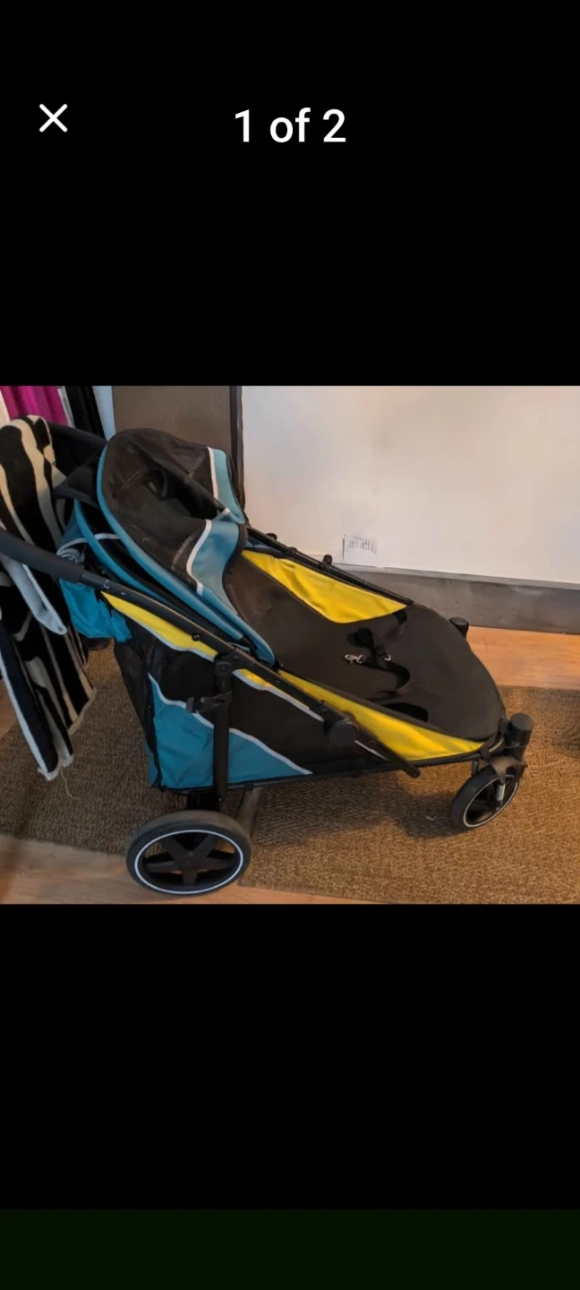This foldable pet stroller has a large breathable mesh for good ventilation. Strong, durable. Not enough use. Item dimensions are 95cm L x 65cm W x 98cm H. The back wheel diameter is 11 inches. It's perfect for transporting your furry friends on walks! Fits through regular sized doors.