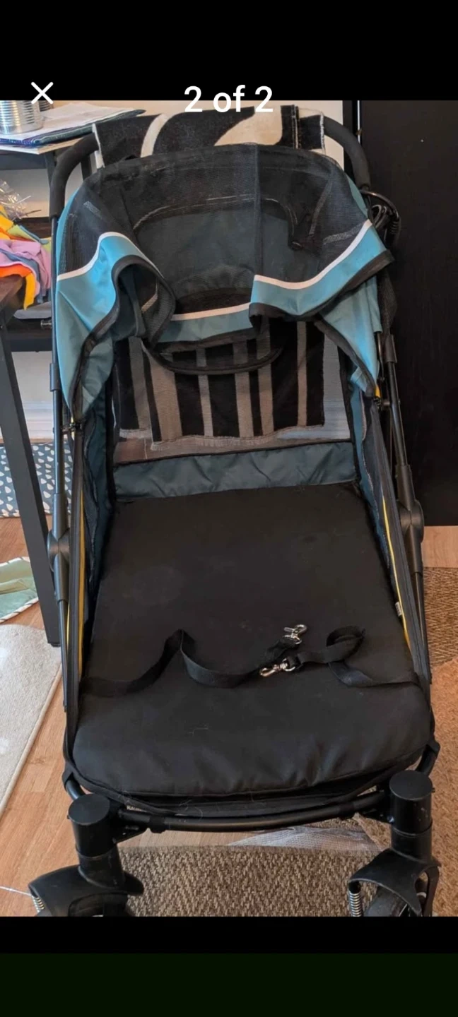 This foldable pet stroller has a large breathable mesh for good ventilation. Strong, durable. Not enough use. Item dimensions are 95cm L x 65cm W x 98cm H. The back wheel diameter is 11 inches. It's perfect for transporting your furry friends on walks! Fits through regular sized doors.