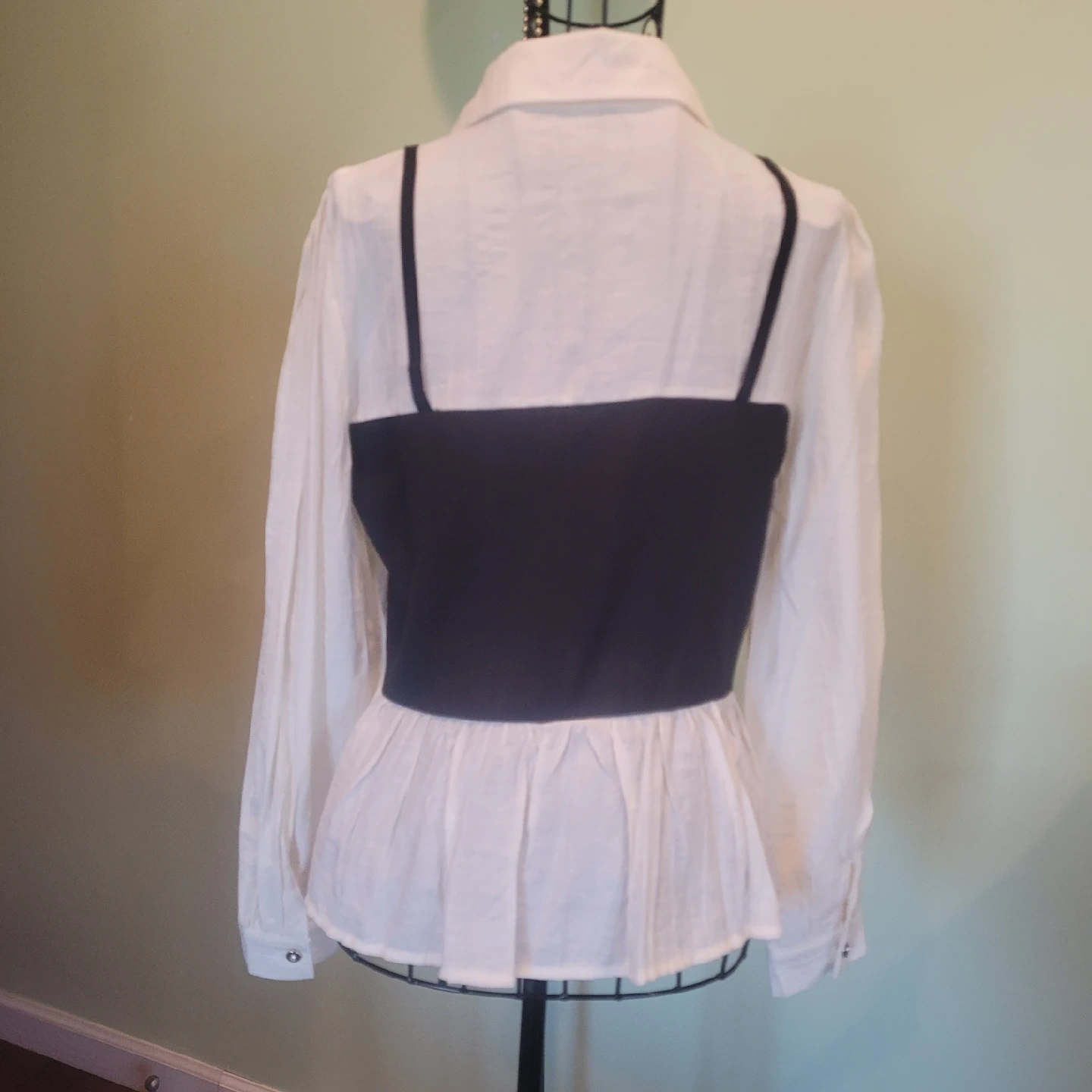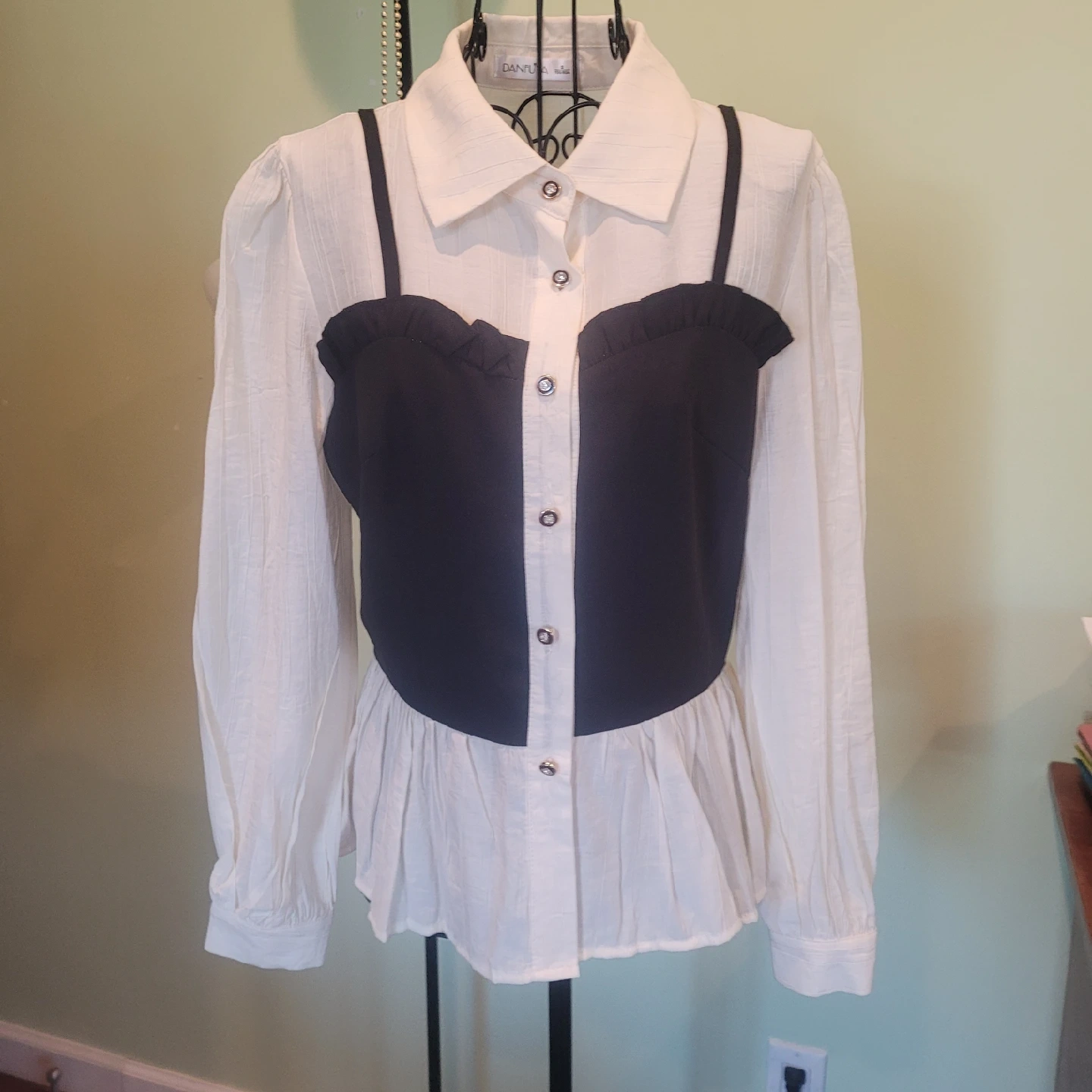 This is a women's blouse from DANVOUY, featuring a unique corset-style design. The blouse is white with a black corset detail on the front. It has long sleeves and a collared neckline. The material appears to be lightweight and comfortable, perfect for a stylish and trendy look