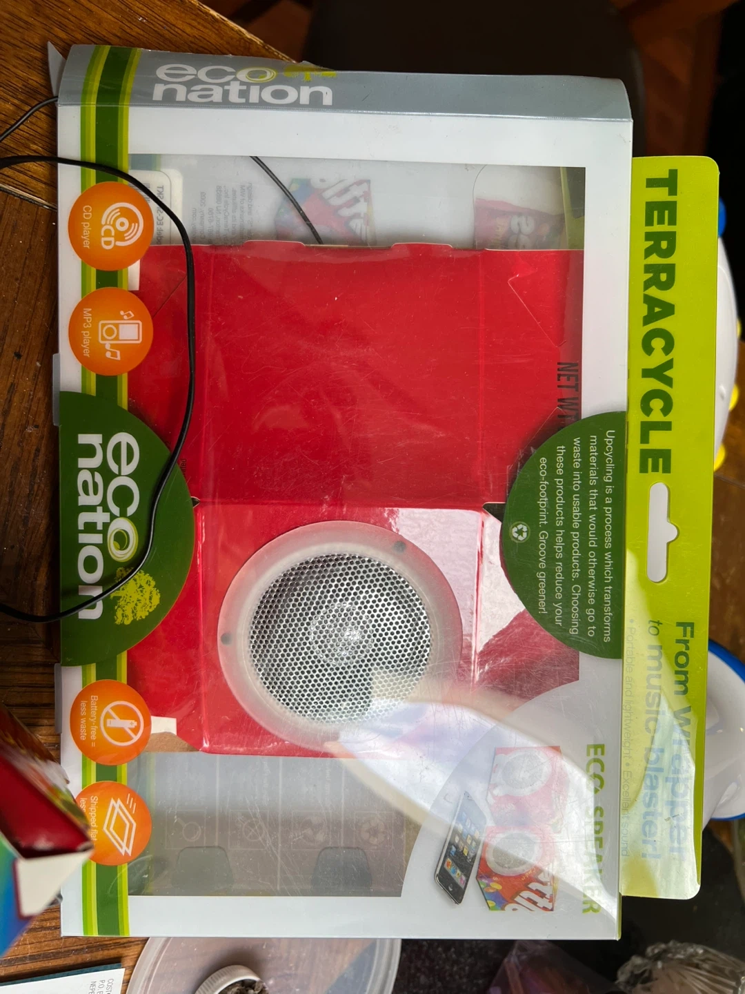 Selling an Eco Nation Eco Speaker! It's a fun speaker made from recycled materials. It can be used with CD players and MP3 players. Comes with the box!