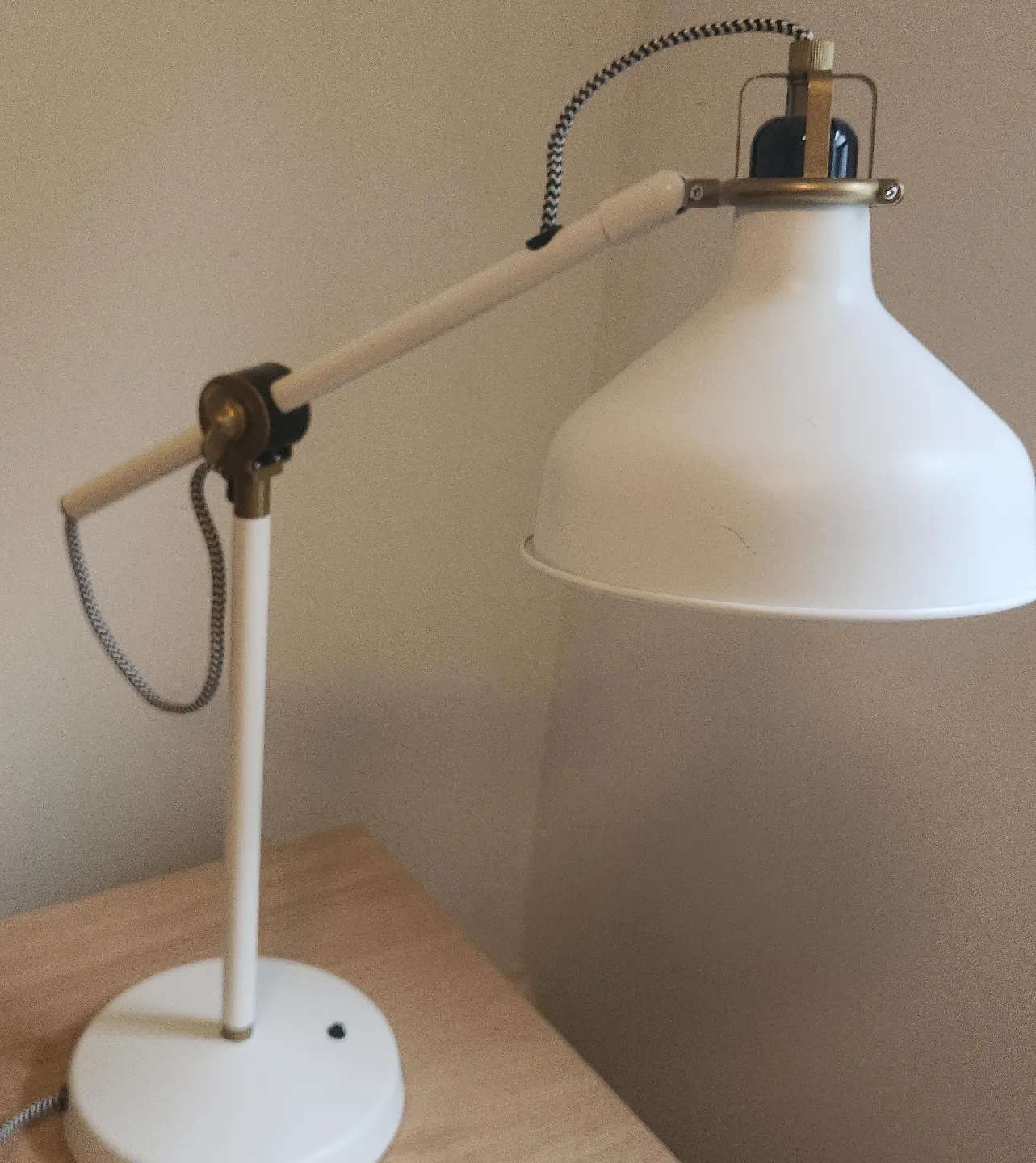 Selling a white adjustable desk lamp. It's in great condition and would be perfect for a home office or bedside table. The adjustable arm makes it easy to direct the light where you need it