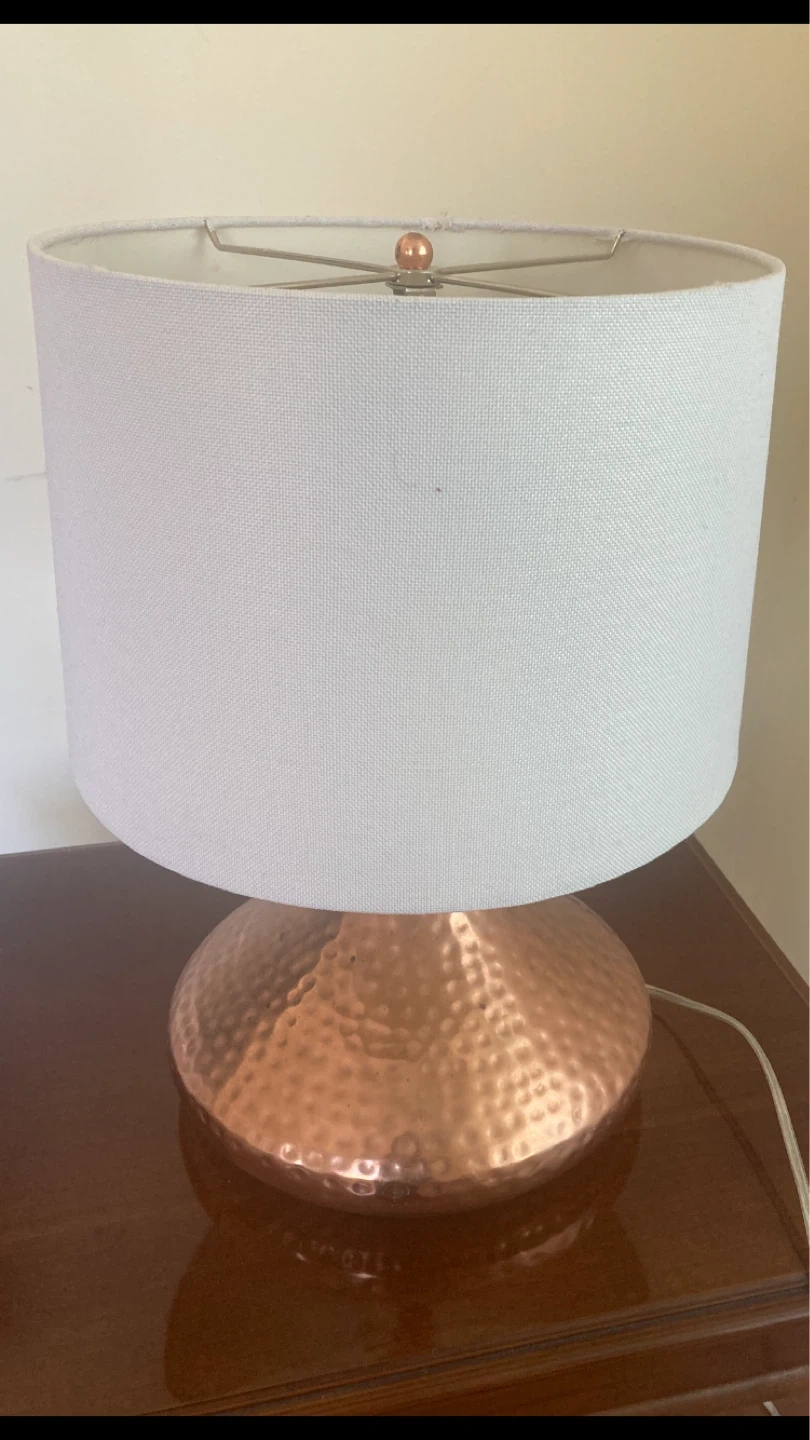 A lovely table lamp featuring a hammered copper base. It has a neutral white fabric shade and a copper ball finial. Perfect for adding a touch of warm ambiance to any room!
