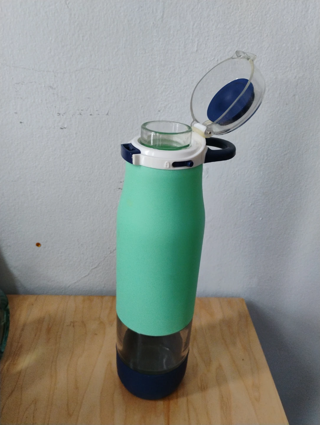 FREE water bottle has a glass body with a protective silicone sleeve and a blue base. It includes a flip-top lid with a carrying loop. The sleeve can be removed.