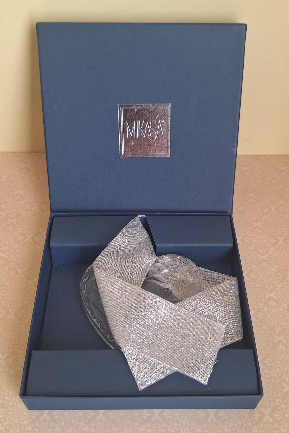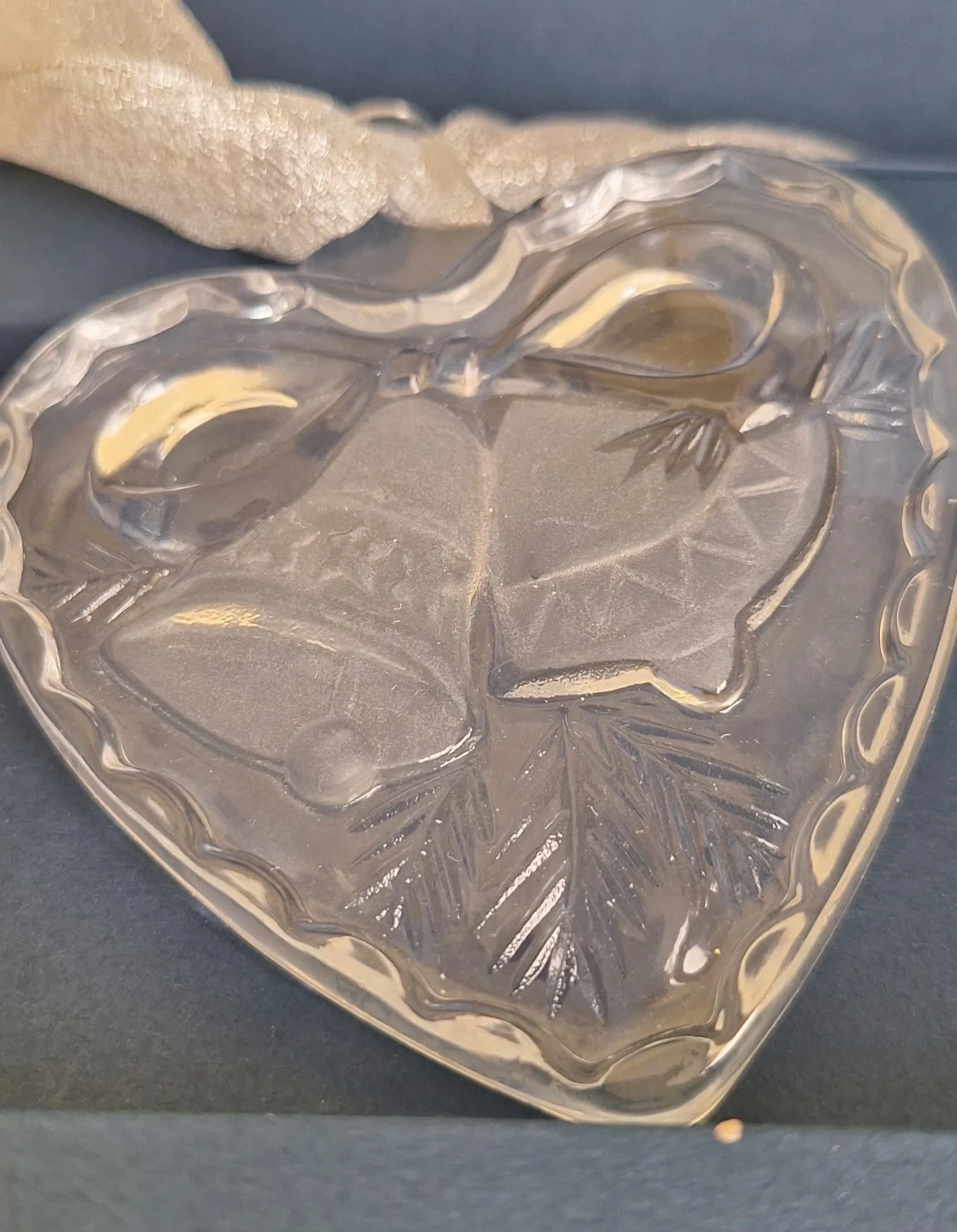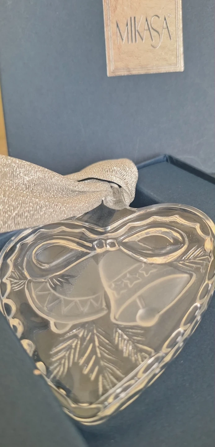 This Mikasa holiday ornament is shaped like a heart. It features a festive bell design etched into the clear glass. Comes in its original box.