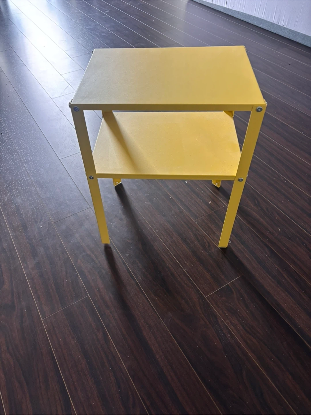 A handy yellow side table with two shelves. Dimensions: 42 cm width, 33.5 cm depth, 52 cm height. Perfect for beside a couch or bed. It's made of metal
