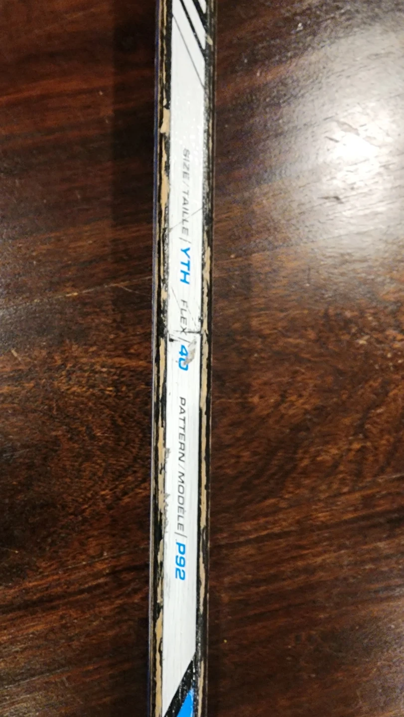 This is a Bauer Ignite 3000 hockey stick. It's a youth size with a flex of 40 and pattern P92. It has visible signs of use but is still functional for play. 50" tall, straight blade for ages that arent quite sure if they shoot left or eight yet.