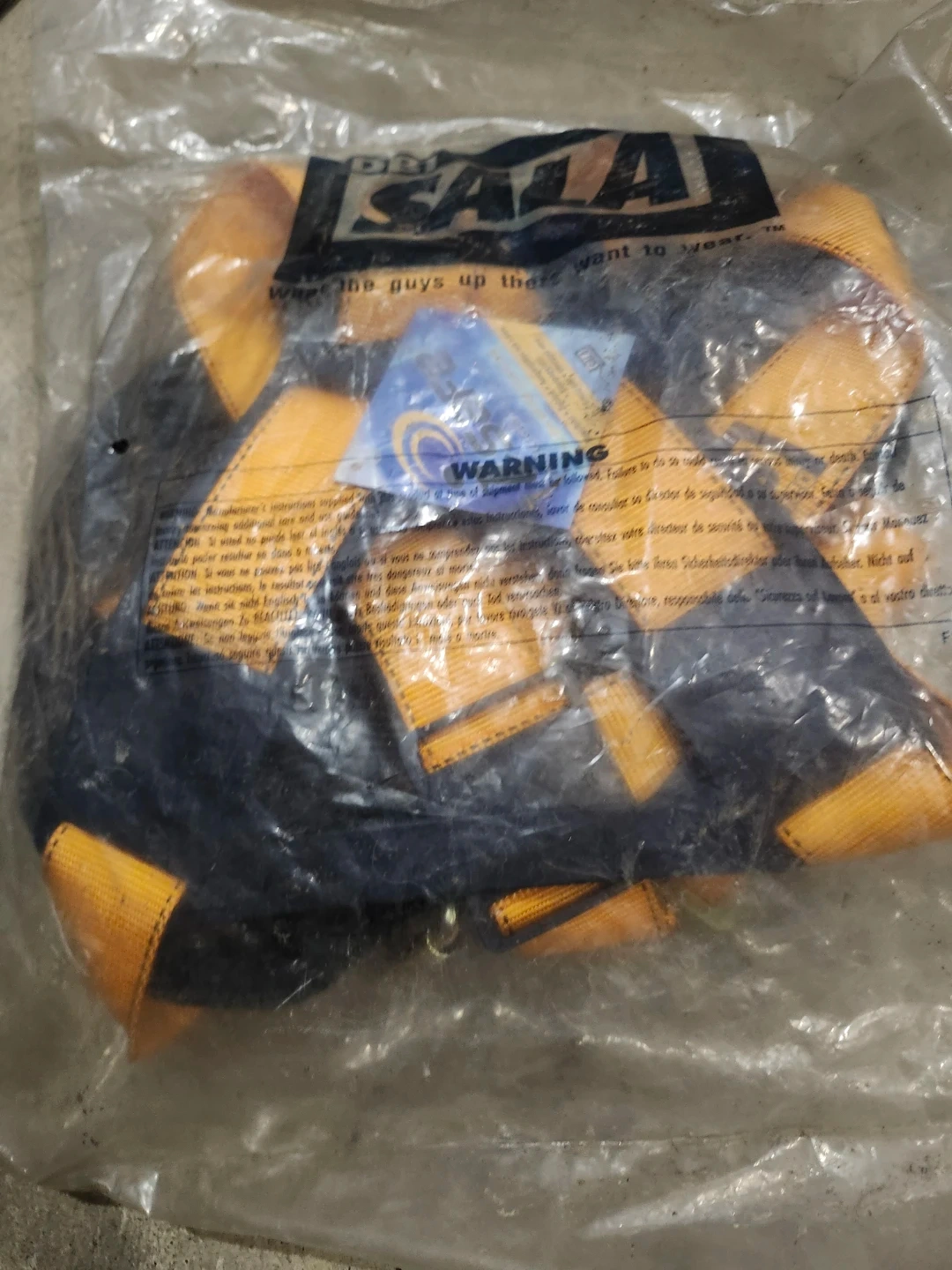 This is a DBI Sala harness, designed for safety. It's a dark black with orange webbing. Comes in original packaging.