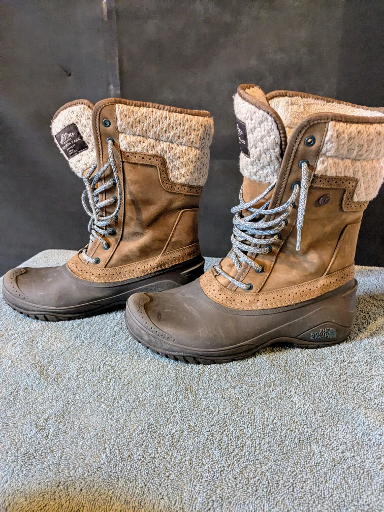 Waterproof, lightly used, perfect sole. Women's winter boots. Brown leather and textile upper. Lace-up closure. Warm fleece lining. Good traction soles. Great for snow and ice.