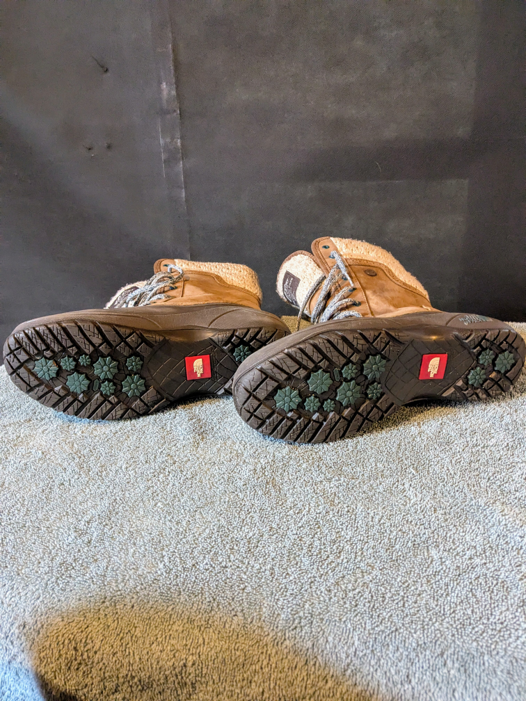 Waterproof, lightly used, perfect sole. Women's winter boots. Brown leather and textile upper. Lace-up closure. Warm fleece lining. Good traction soles. Great for snow and ice.