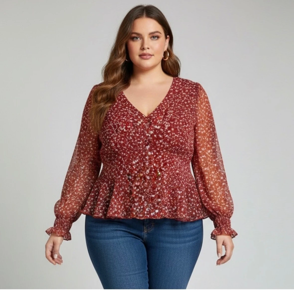 This is a beautiful ANVI blouse in a vibrant red floral print. It features a flattering V-neck and long sleeves with ruffled cuffs. Perfect for adding a pop of colour to your wardrobe!