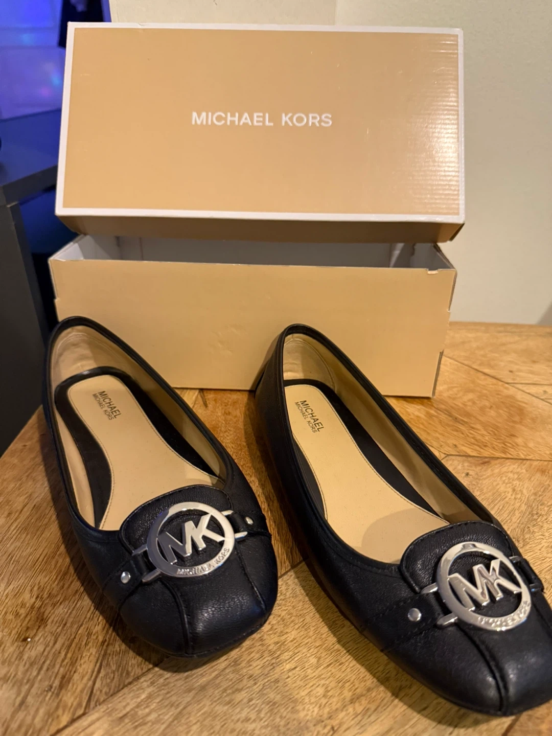 Selling a pair of Michael Kors black leather flats in size 7.5! They're in great shape and come with the original box. The box shows that they were originally bought for $138. These stylish and comfortable flats are perfect for any occasion