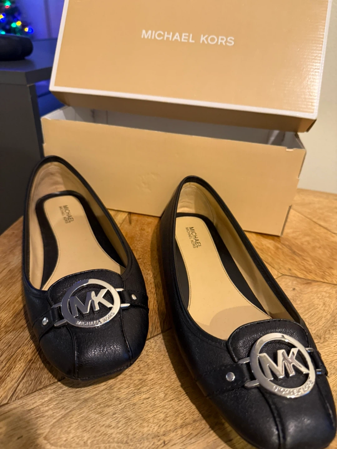 Selling a pair of Michael Kors black leather flats in size 7.5! They're in great shape and come with the original box. The box shows that they were originally bought for $138. These stylish and comfortable flats are perfect for any occasion