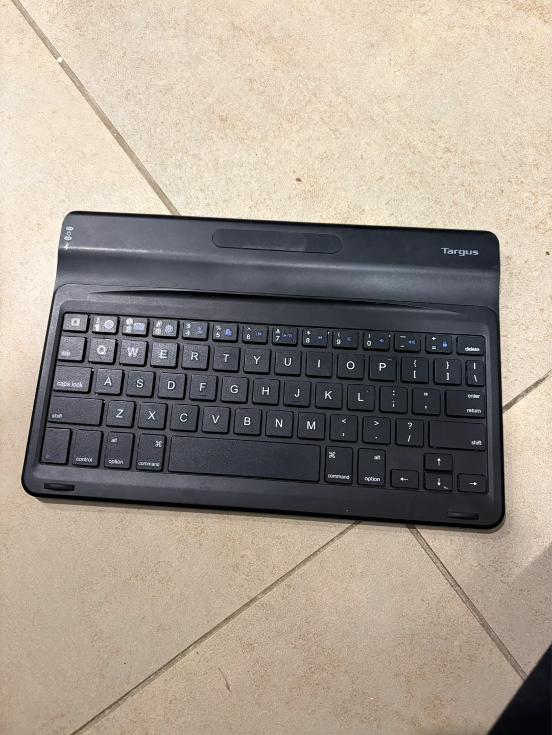 This is a Targus wireless keyboard. It's black and designed for portability. Includes a charging port and power switch.