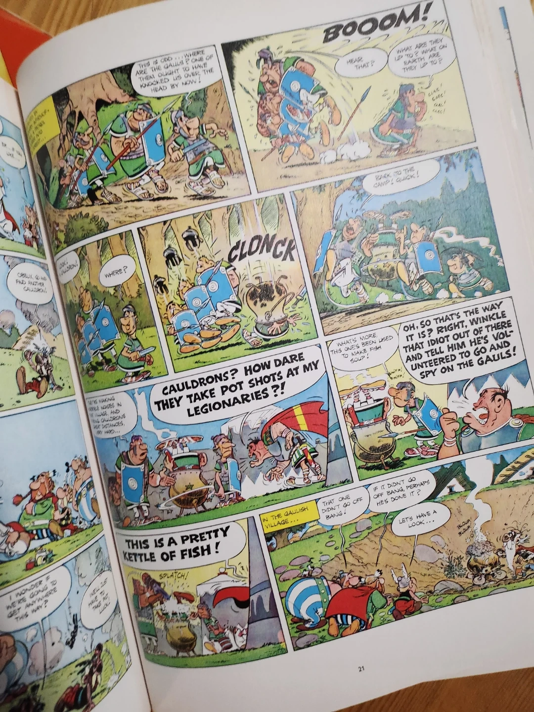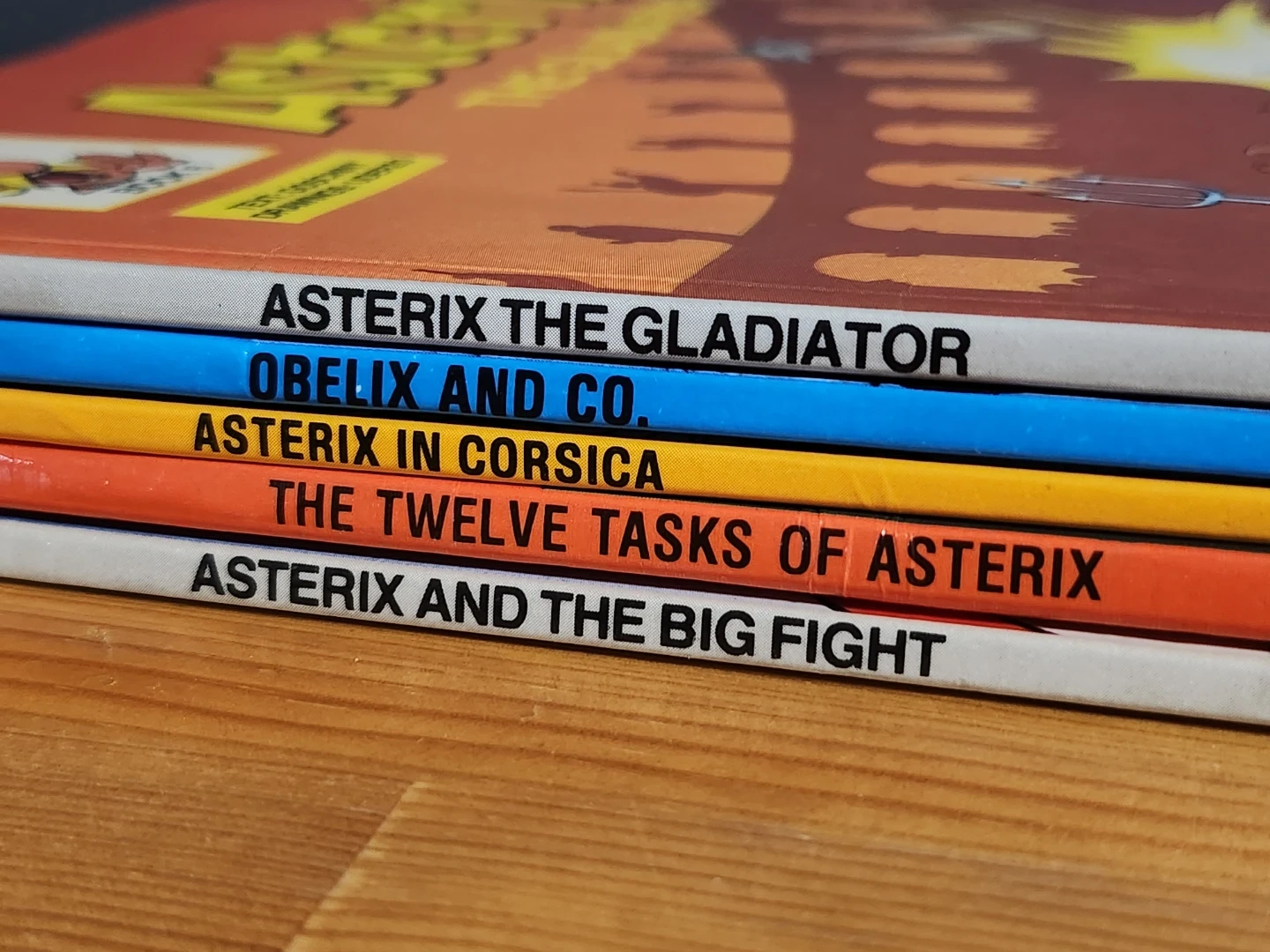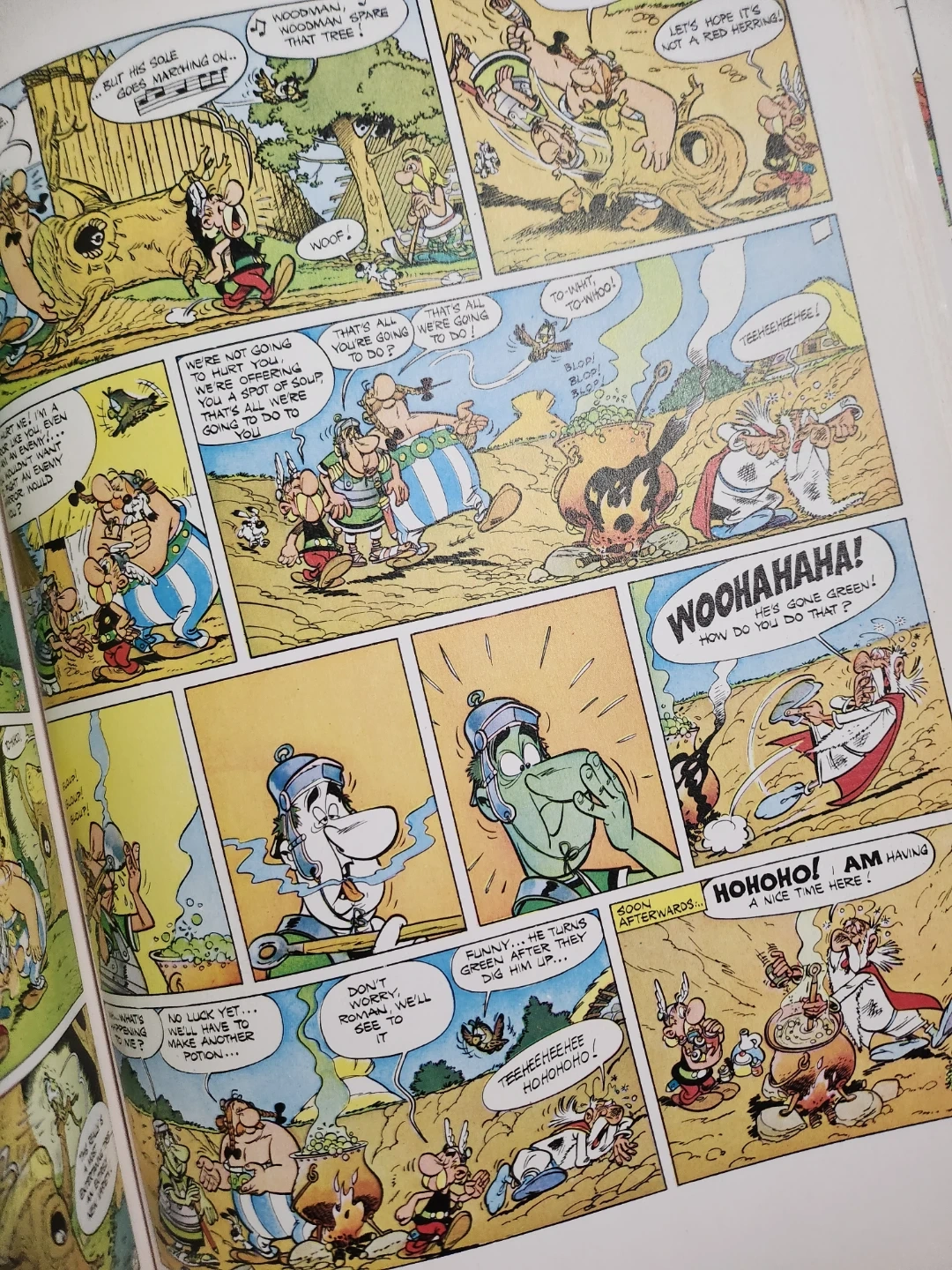 A collection of comics from Asterix. It features the beloved characters Asterix and Obelix in their adventures. The book contains comic strips with dialogue and illustrations by renowned illustration artists, Albert Uderzo and Didier Conrad.