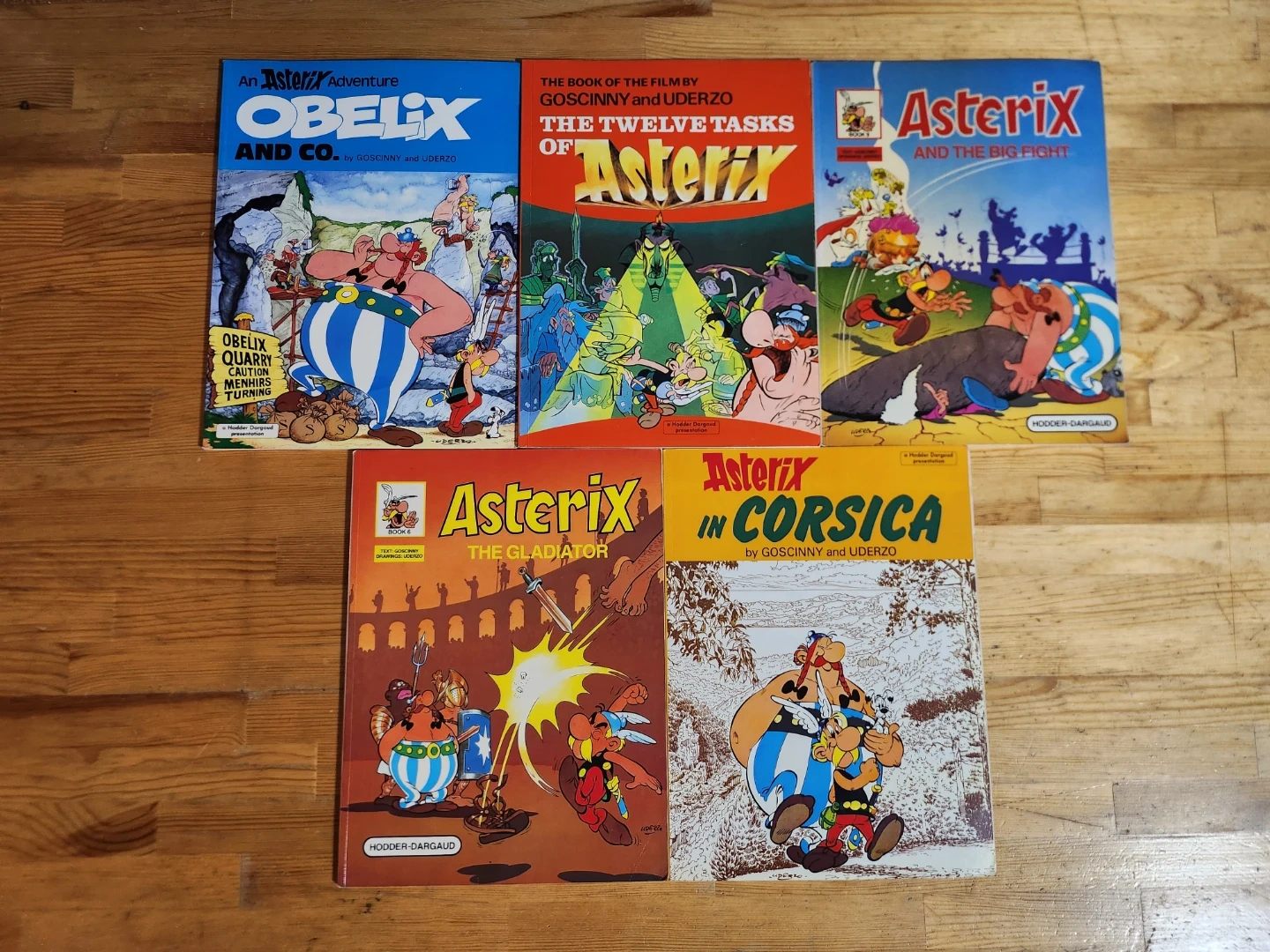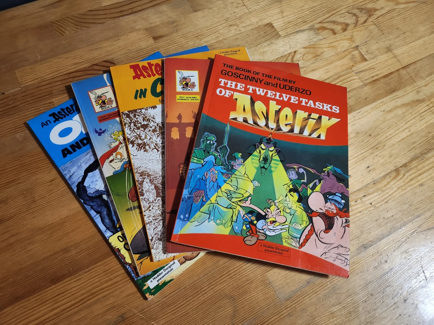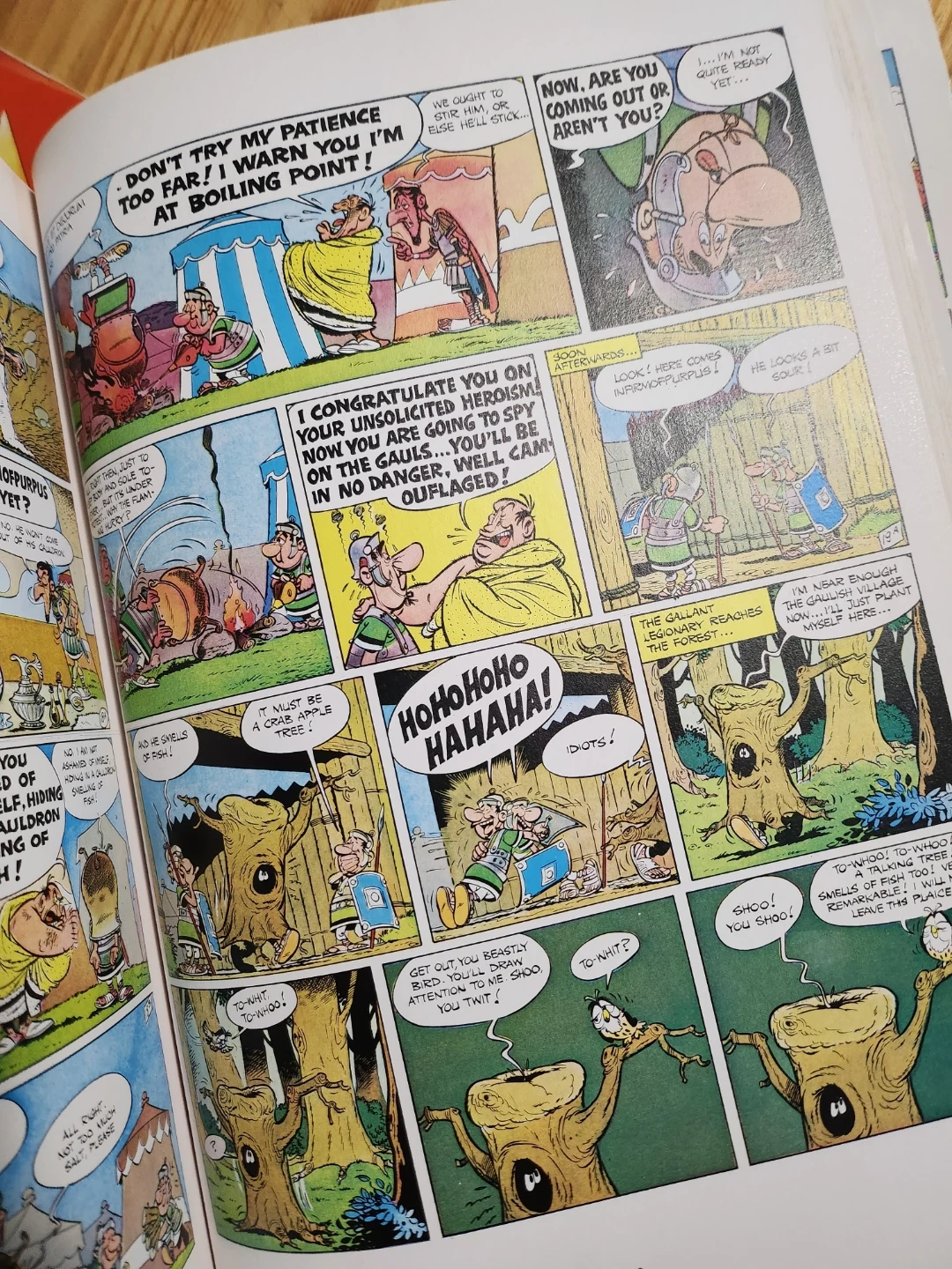 A collection of comics from Asterix. It features the beloved characters Asterix and Obelix in their adventures. The book contains comic strips with dialogue and illustrations by renowned illustration artists, Albert Uderzo and Didier Conrad.