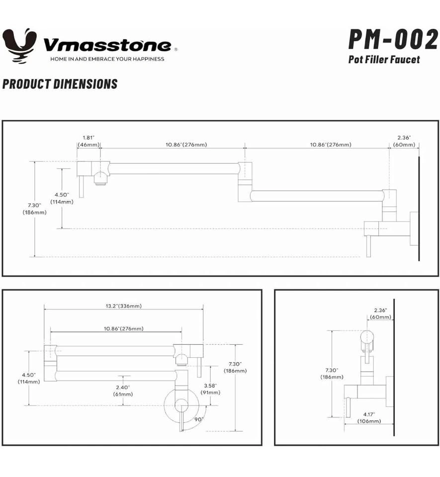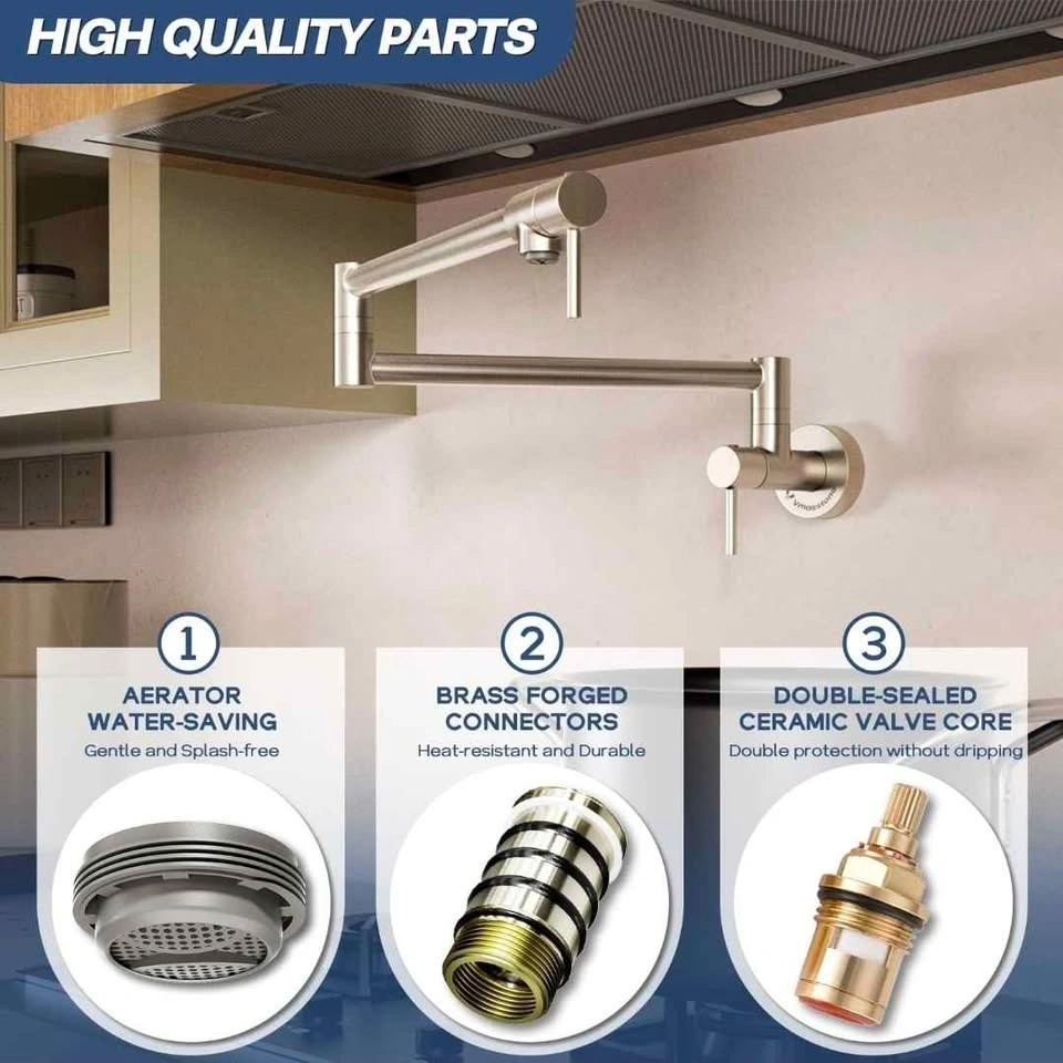 The VMASSTONE PM002 Pot Filler Faucet is made from premium solid brass, ensuring safe drinking water. Compared to stainless steel, brass offers superior heat and pressure resistance, providing lasting durability and stability.