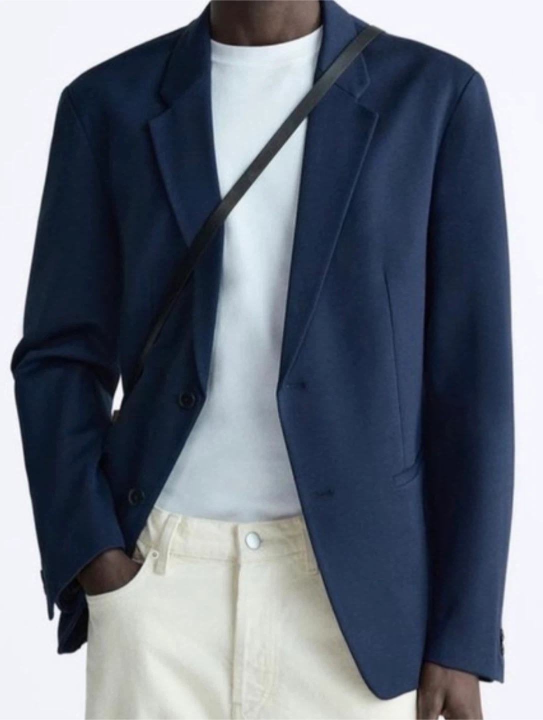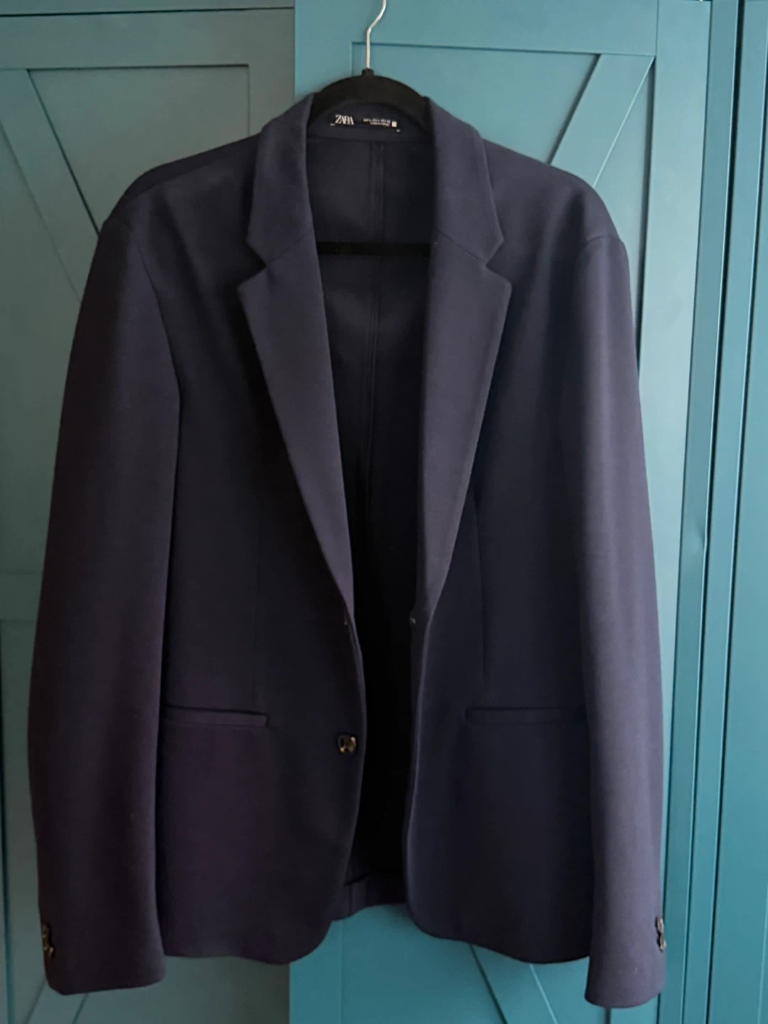 ZARA comfort jacket in a navy blue colour. It's a classic blazer style. Material is likely a blend for comfort. This jacket is great for smart casual looks.
